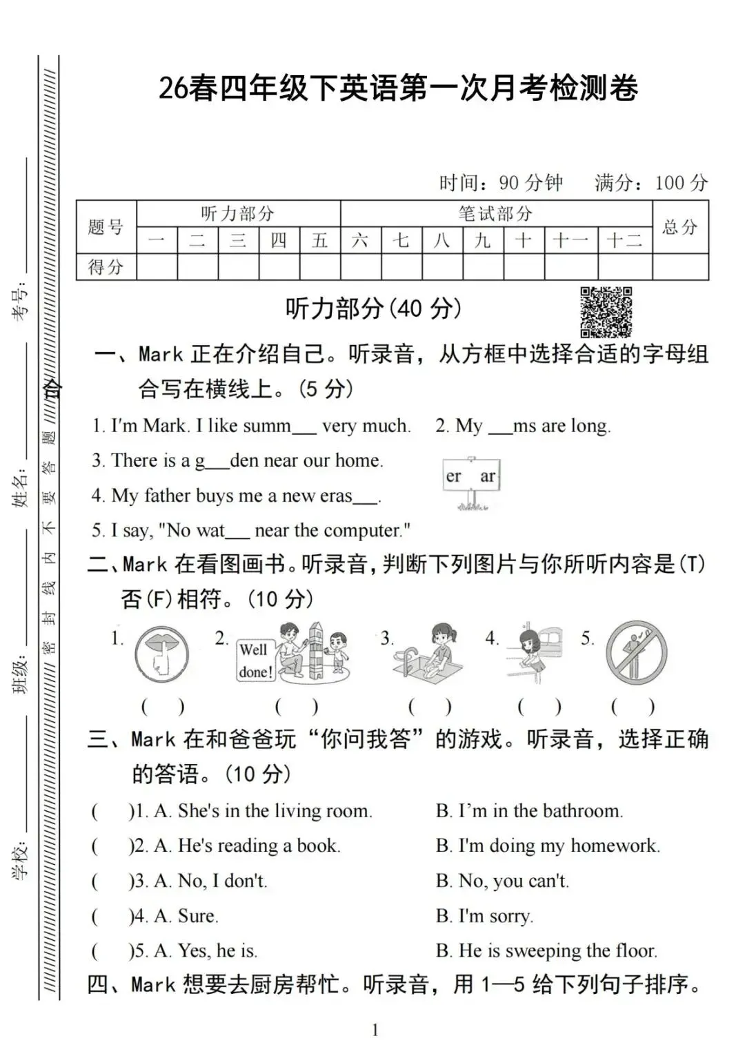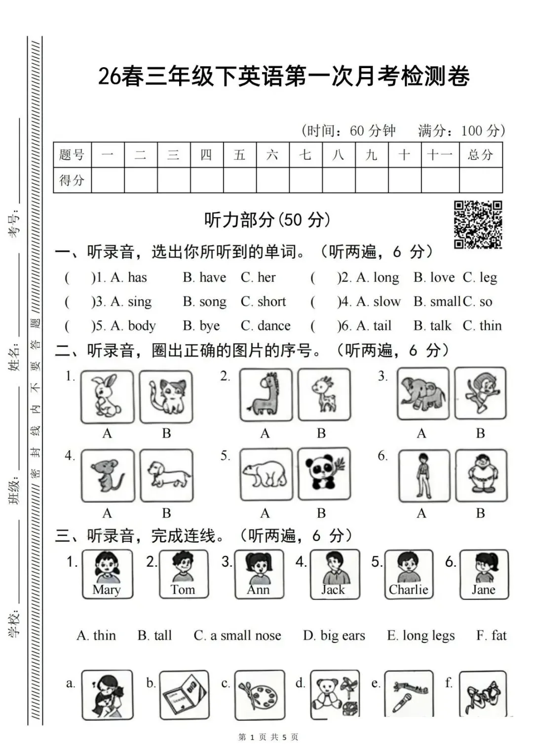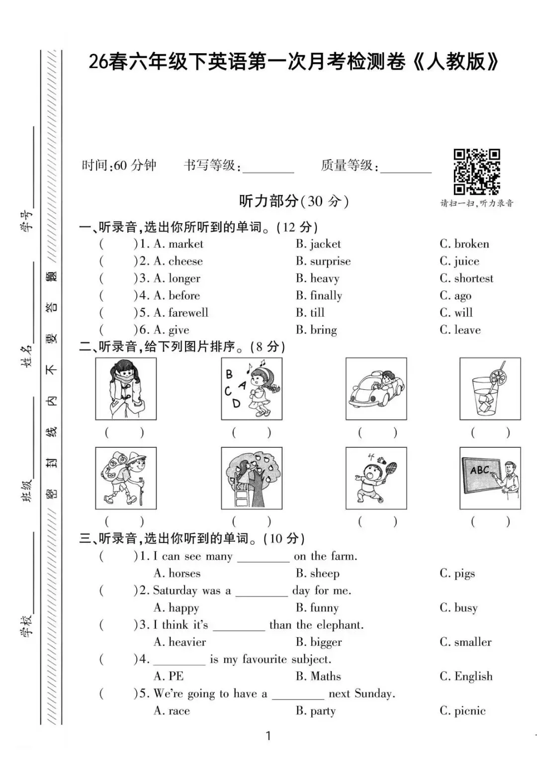 26春六年级下册英语第一次月考检测卷电子版 可打印