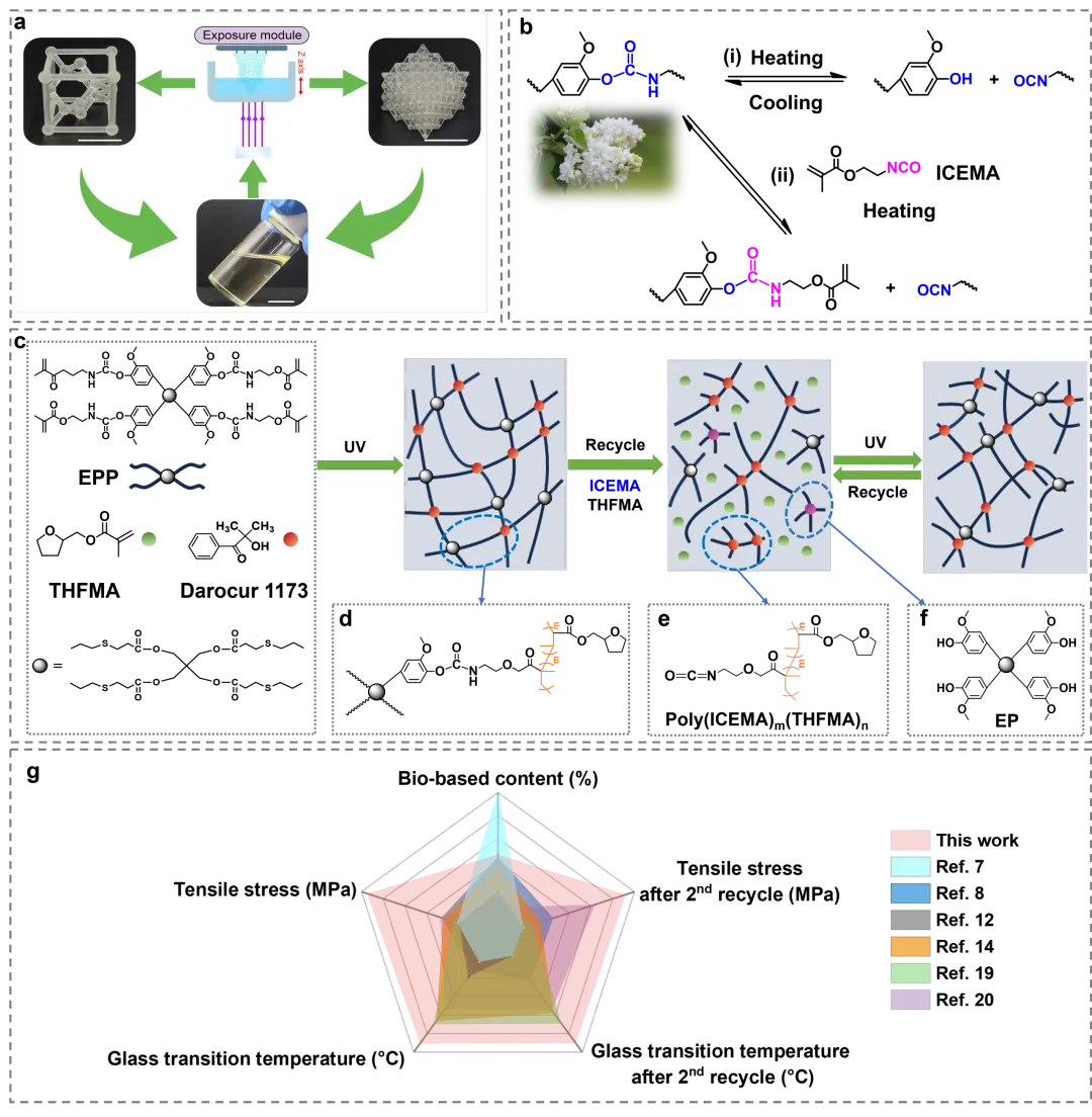 图1.基于酚氨酯键(PCBs)的生物基可循环光固化3D打印树脂:(a)生物基光固化树脂在DLP打印、化学溶解及再打印过程中的示意图(比例尺:1厘米);(b)动态PCB的解离机制:(i)无额外反应物,(ii)添加ICEMA单体;(c)树脂经光固化(或打印)、回收及再次光固化(或再打印)后的结构演变示意图;(d-f)打印或回收后的可能结构;(g)本研究与其它工作所报道的树脂性能对比。