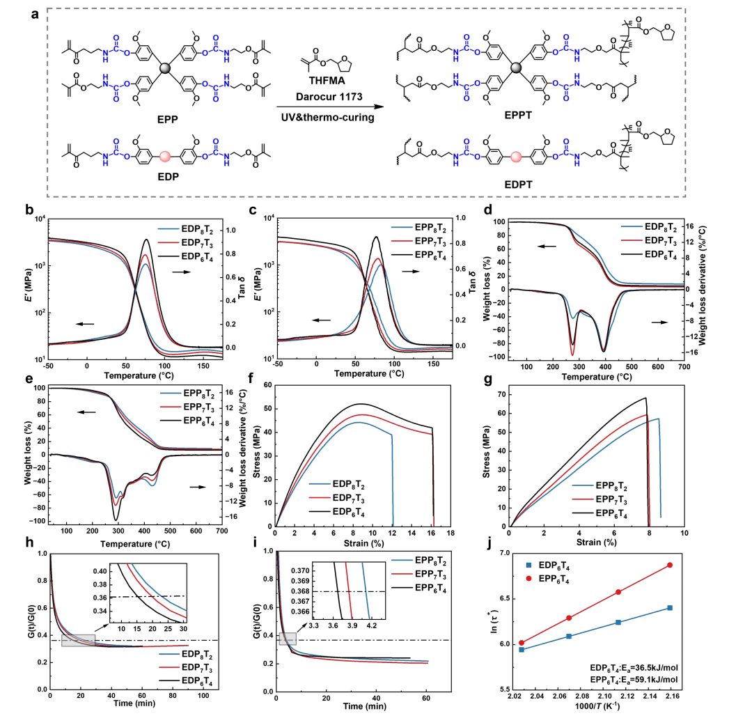 图2. EDPT 和 EPPT 的常规性能及应力松弛性能:(a) 树脂的制备和固化;(b、c) 储能模量和损耗因子;(d、e) TGA和DTG曲线;(f、g) 应力–应变曲线;(h、i) EDPT和EPPT的应力松弛曲线;(j) EDP6T4和EPP6T4的特征松弛时间对数与 1000/T关系图。