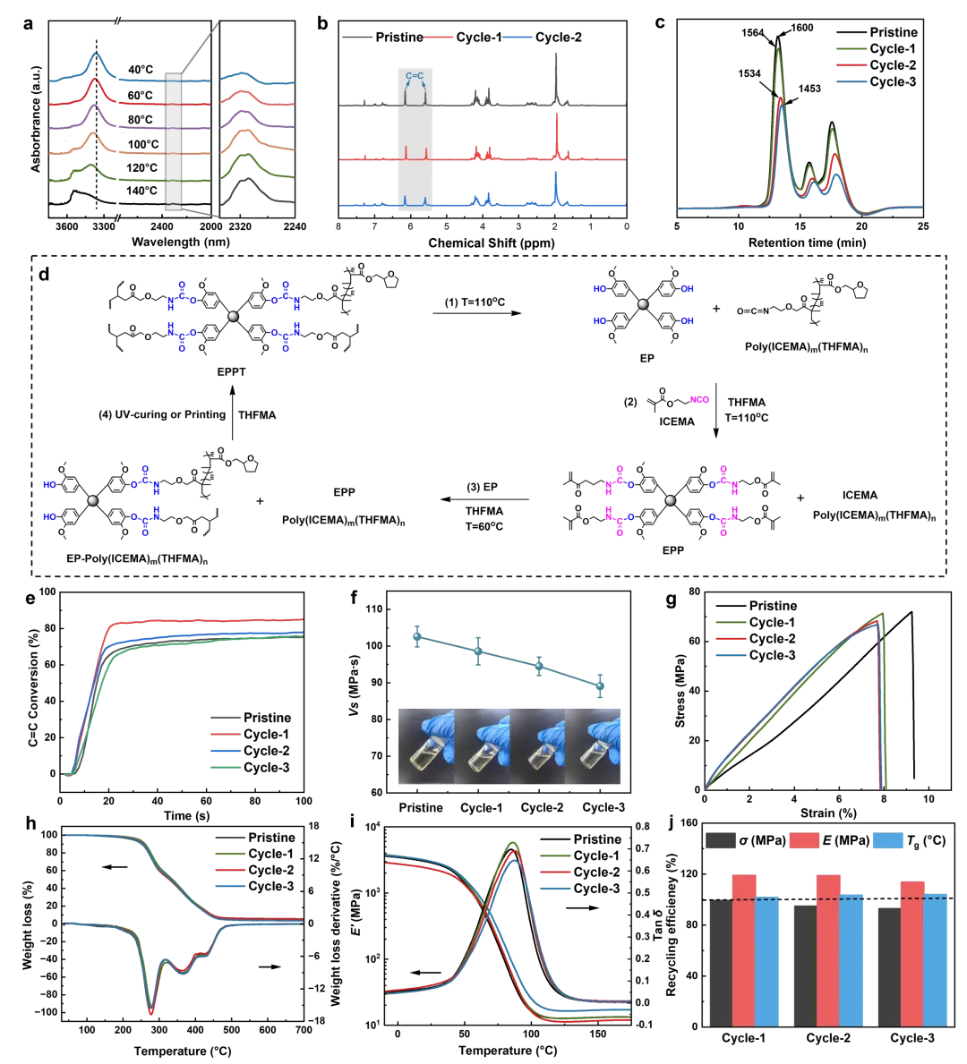 图3. EPP6T4 的化学循环回收机制与性能:(a)EPP6T4在40至140℃的变温红外谱图;(b)原始树脂与再生树脂的1HNMR谱;(c)原始树脂与再生树脂的GPC曲线;(d)再生过程中EPP6T4的反应机理示意图;原始树脂与再生树脂的(e)C=C转化率曲线,(f)粘度,(g)应力–应变曲线,(h)TGA与DTG曲线,(i)储能模量与损耗因子曲线,(j)拉伸强度(σ)、杨氏模量(E)及Tg的回收效率。