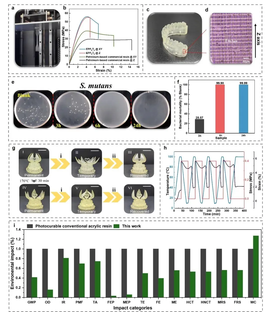 图4. EPP6T4的3D打印性能、多功能性及环境评估:(a)用于力学测试的3D打印试样照片;(b)EPP6T4与商用树脂3D打印样品在XY方向和Z方向的应力–应变曲线;(c)3D 打印牙套实物照;(d)3D 打印牙套Z轴精度;(e)EPP6T4对变形链球菌的抗菌效果(3、6、24小时),空白组作为对照;(f)EPP6T4的抗菌率;(g)形状记忆性的视觉展示,其中(ⅰ)表示 90℃ 下的变形过程及冷水中的定型过程,(ⅰⅰ)表示 90℃ 下的复形过程;(h)EPP6T4连续双形状记忆循环曲线;(i)EPP6T4与传统环氧丙烯酸酯光固化树脂的生命周期评价。