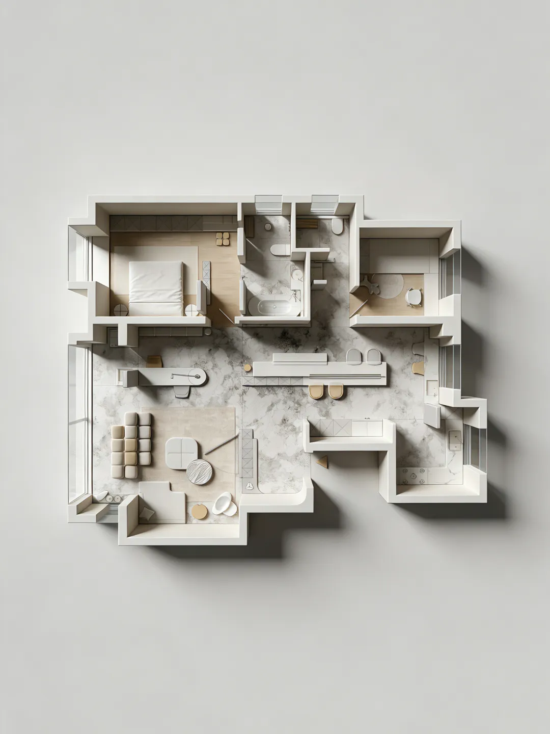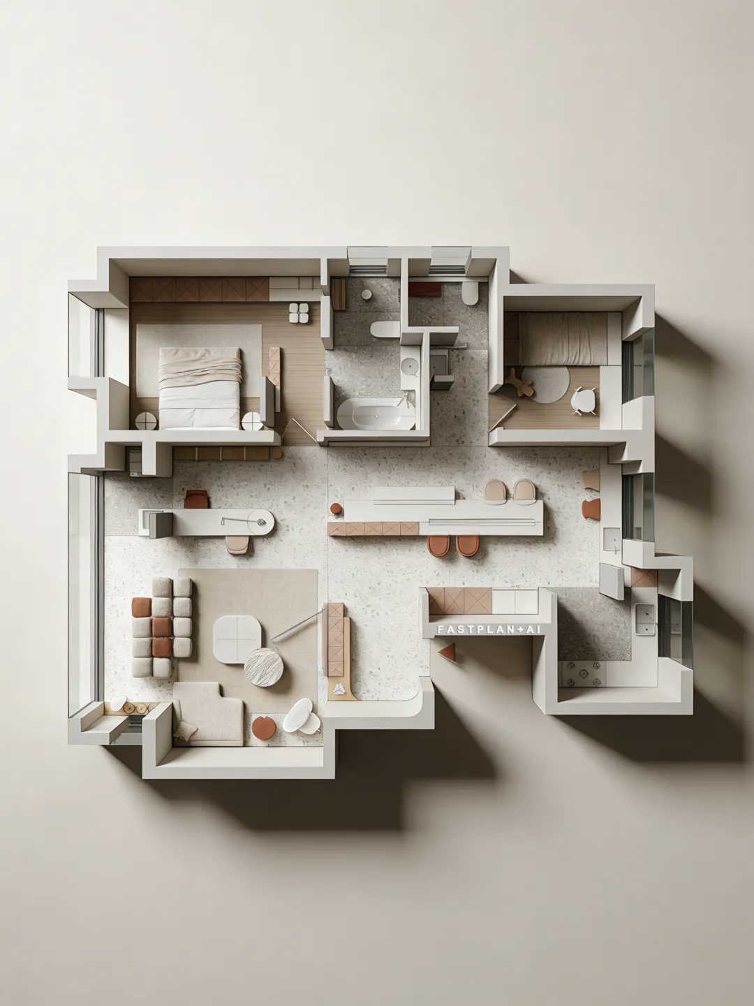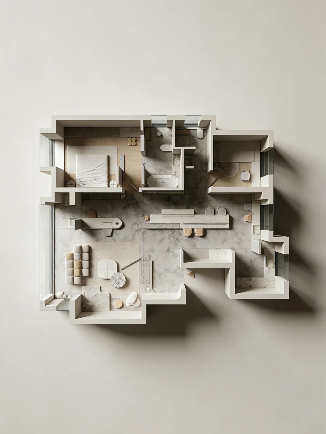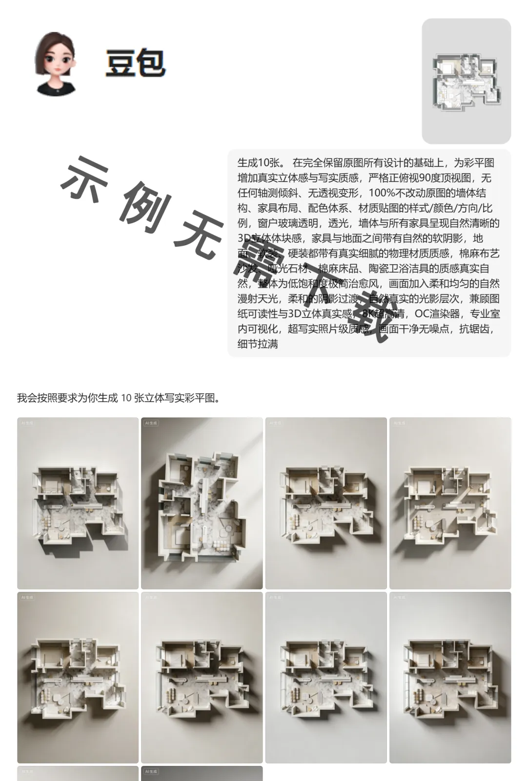 生成10张。 在完全保留原图所有设计的基础上,为彩平图增加真实立体感与写实质感,严格正俯视90度顶视图,无任何轴测倾斜、无透视变形,100%不改动原图的墙体结构、家具布局、配色体系、材质贴图的样式/颜色/方向/比例,窗户玻璃透明,透光,墙体与所有家具呈现自然清晰的3D立体体块感,家具与地面之间带有自然的软阴影,地面、软装、硬装都带有真实细腻的物理材质质感,棉麻布艺沙发、哑光石材、棉麻床品、陶瓷卫浴洁具的质感真实自然,整体为低饱和度极简治愈风,画面加入柔和均匀的自然漫射天光,柔和的阴影过渡,自然真实的光影层次,兼顾图纸可读性与3D立体真实感,8K超高清,OC渲染器,专业室内可视化,超写实照片级质感,画面干净无噪点,抗锯齿,细节拉满