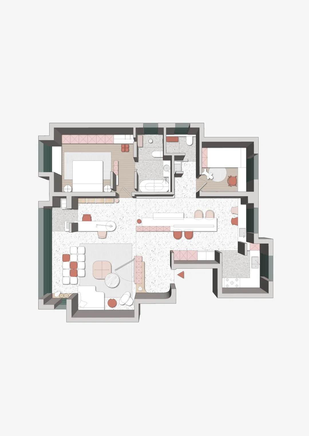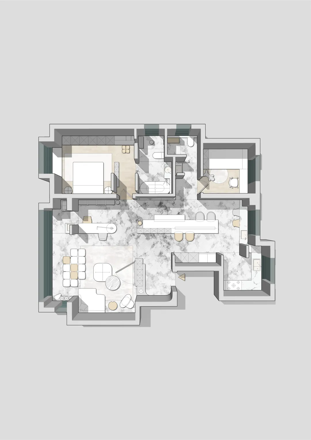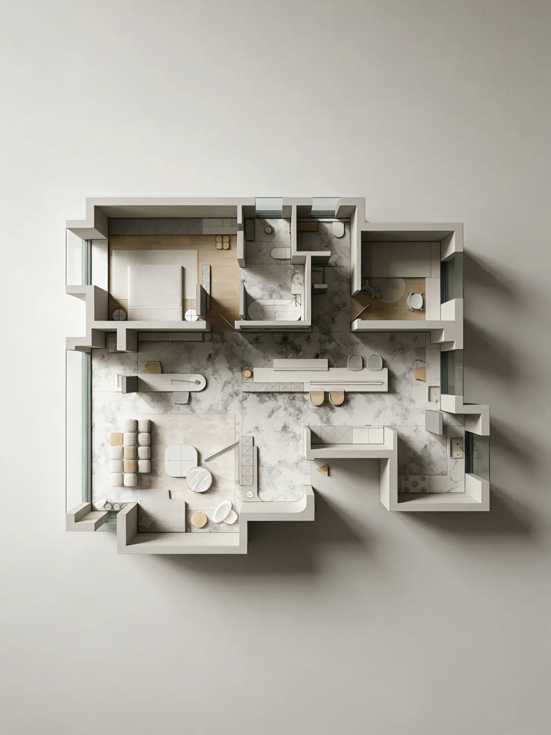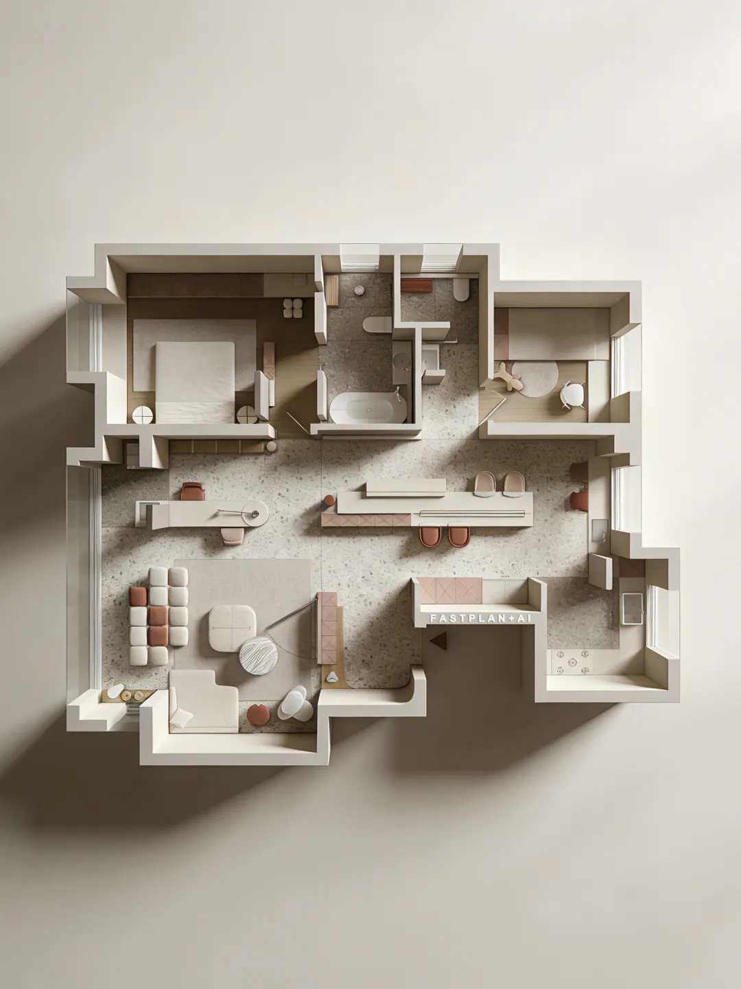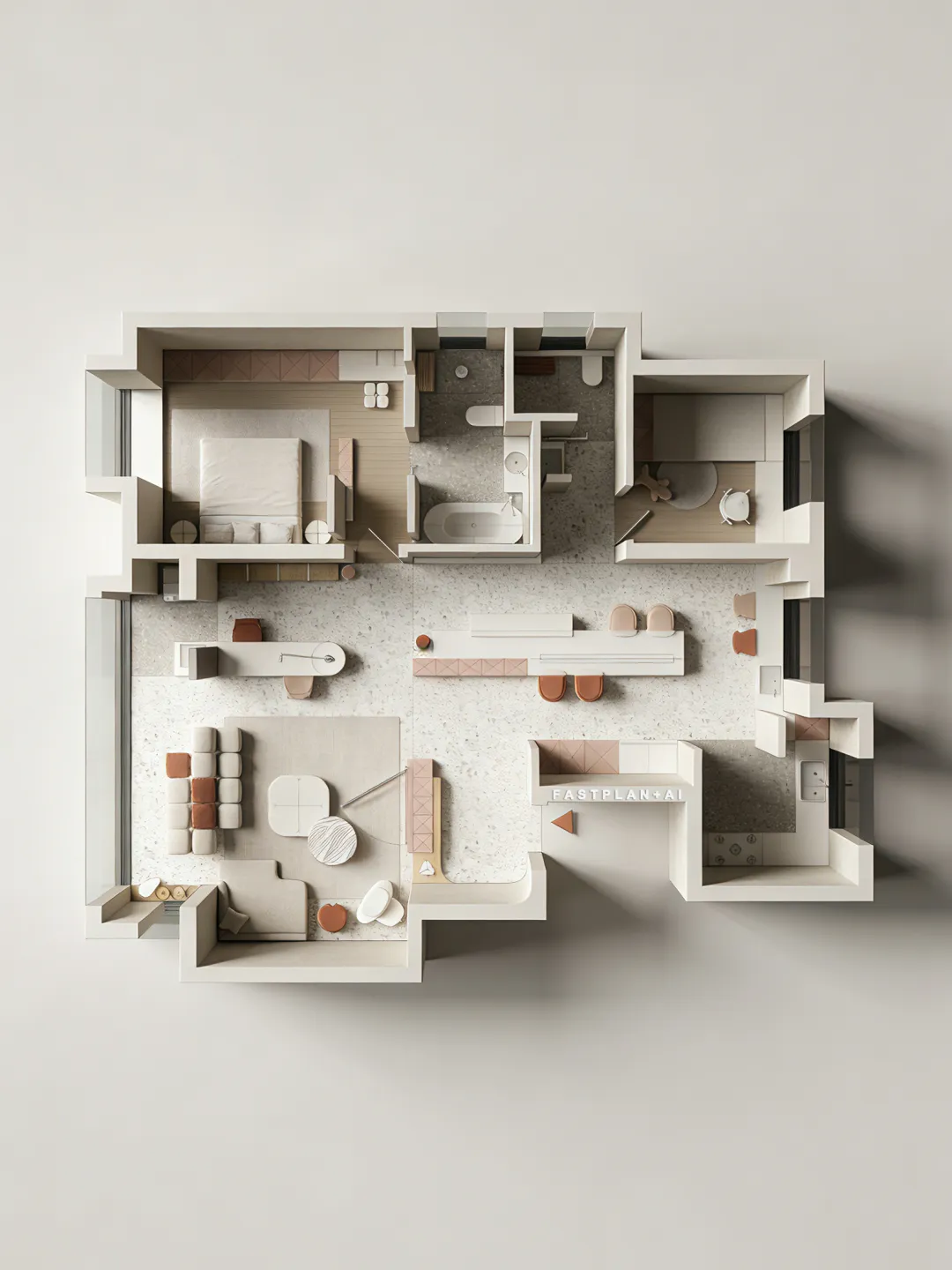 生成10张。 在完全保留原图所有设计的基础上,为彩平图增加真实立体感与写实质感,严格正俯视90度顶视图,无任何轴测倾斜、无透视变形,100%不改动原图的墙体结构、家具布局、配色体系、材质贴图的样式/颜色/方向/比例,窗户玻璃透明,透光,墙体与所有家具呈现自然清晰的3D立体体块感,家具与地面之间带有自然的软阴影,地面、软装、硬装都带有真实细腻的物理材质质感,棉麻布艺沙发、哑光石材、棉麻床品、陶瓷卫浴洁具的质感真实自然,整体为低饱和度极简治愈风,画面加入柔和均匀的自然漫射天光,柔和的阴影过渡,自然真实的光影层次,兼顾图纸可读性与3D立体真实感,8K超高清,OC渲染器,专业室内可视化,超写实照片级质感,画面干净无噪点,抗锯齿,细节拉满