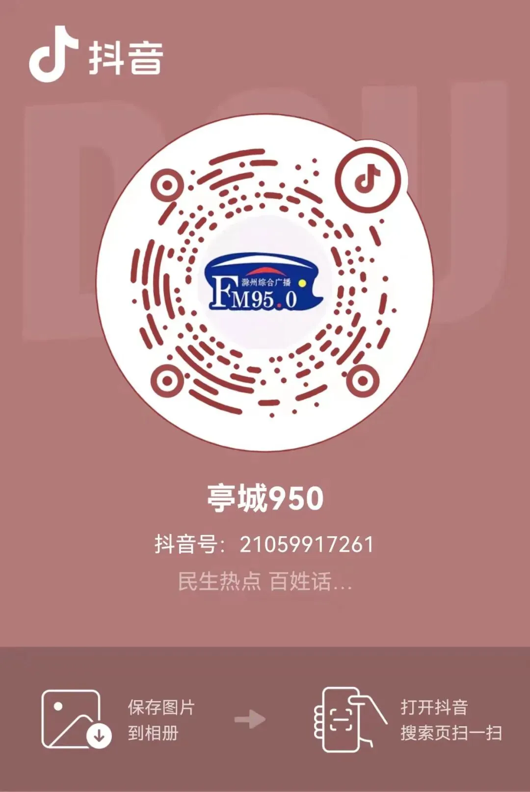 打开抖音扫码或抖音搜索“亭城950”关注,在线收看