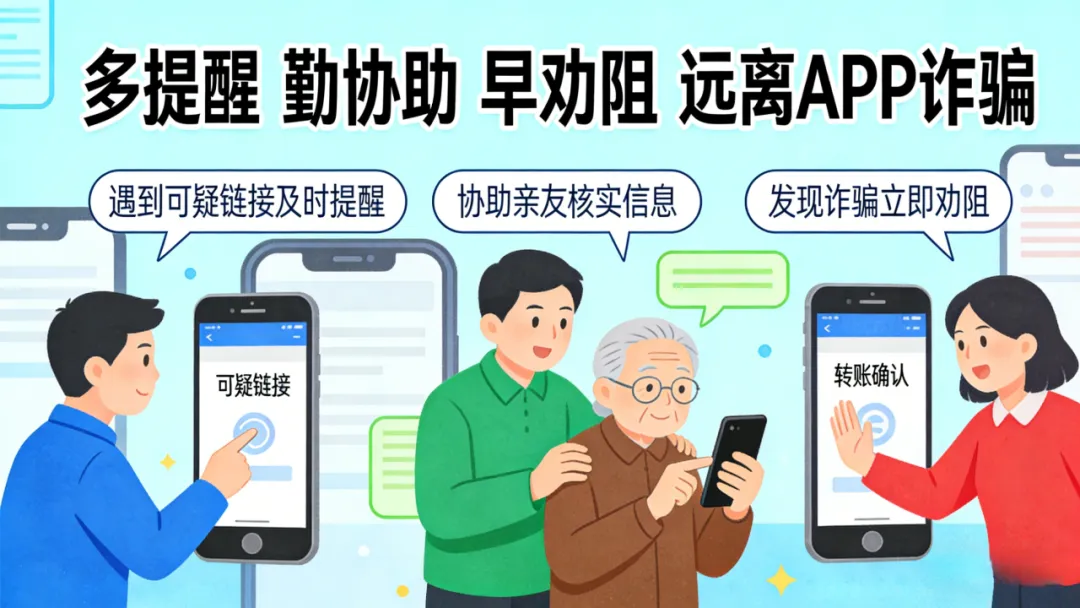 发现身边人准备下载非官方APP、点击陌生链接时,立即阻止,耐心解说此类行为的危害性,避免其造成更严重的后果,守护来之不易的钱财。
