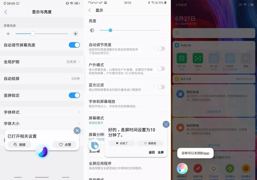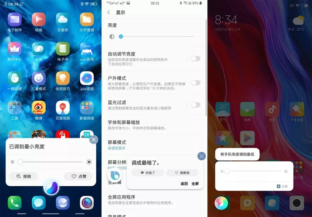 在最基本的调节亮度方面,小爱同学和 Jovi 除了显示反馈外,还会在对话框中加入音量条,相对比较直观。Bixby 则是直接将整个界面跳转到设置中,这一点有点不够人性化。