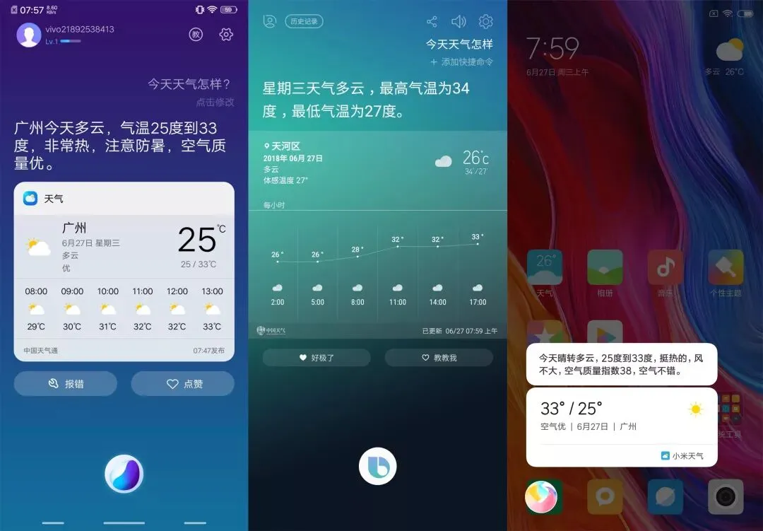 不少人每天出门前比较关心天气。在通过语音询问天气方面,Jovi 和 Bixby 都是描述+每小时走势的形式,小爱则是描述+最高/最低气温。描述用词上,Bixby 偏正经,Jovi 和小爱会提示“非常热”、“挺热的”,更有温度,相对而言 Jovi 比较完整。