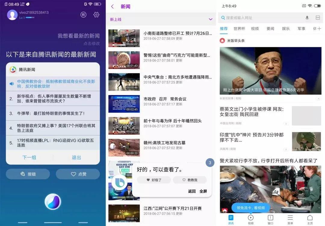 看完天气,接着再想看看今天发生的大事。在接收到“我想看最新的新闻”命令时,Jovi 会引入腾讯新闻源,逐个朗读标题,并支持分组切换;Bixby 调出内置的视频 APP,直接跳转到“新闻”频道;小爱同学则是打开浏览器切换到“资讯”选项卡。