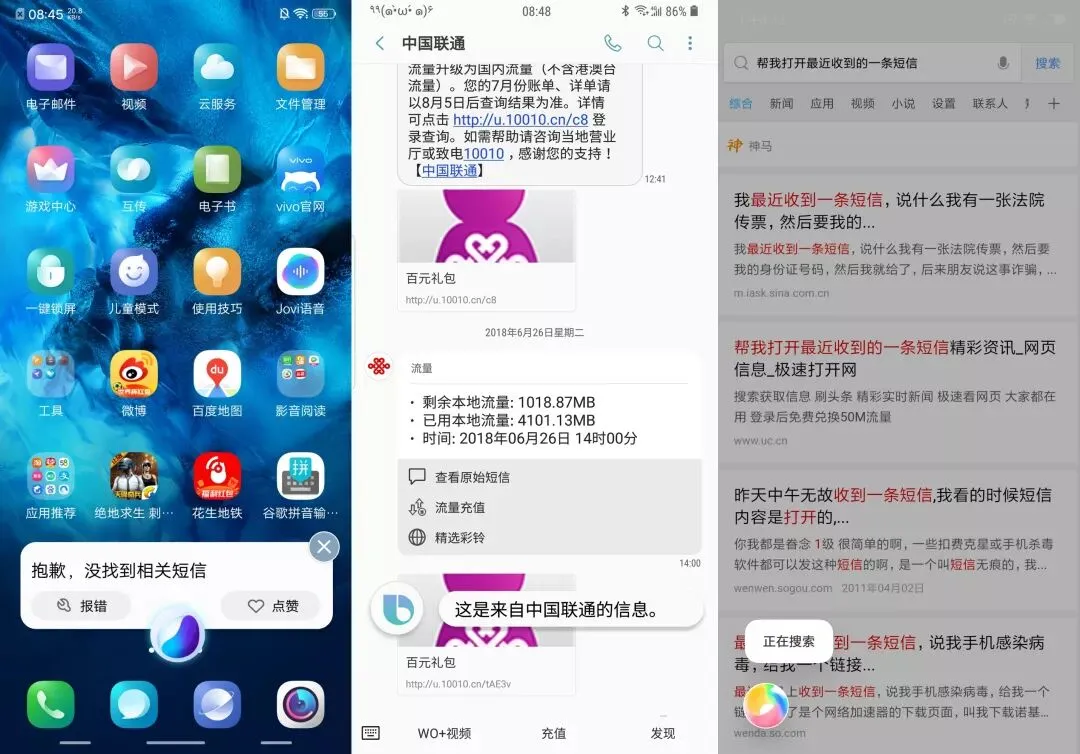 接下来命令“帮我打开最近收到的一条短信”,Jovi 显示“没找到相关短信”,小爱同学直接跳转到浏览器搜索界面,而 Bixby 则成功跳转到最新短信并朗读。