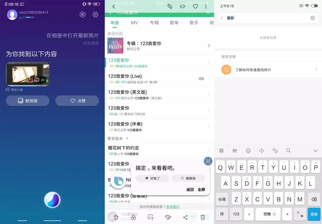 “在相册中打开最新的照片”命令,本意是通过调用内置相册来打开一张最近添加的图片,这点也是只有 Bixby 做到了。Jovi 回复的是百度图片搜索“相册”的结果,小爱同学则是默默打开相册搜索功能,并输入关键字“最新”。