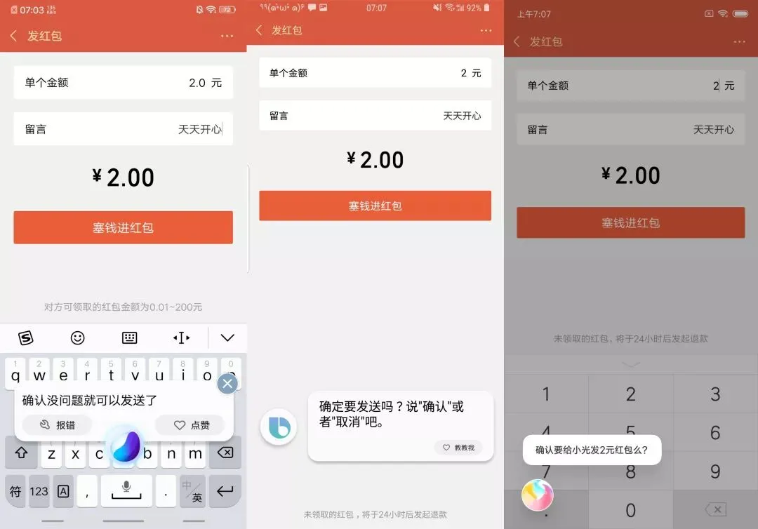 首先是发微信红包并备注,三者表现都还不错,不过 Bixby 和小爱同学会问一句是否确认要发,比较保险,如果回复“取消”,红包就会撤销。