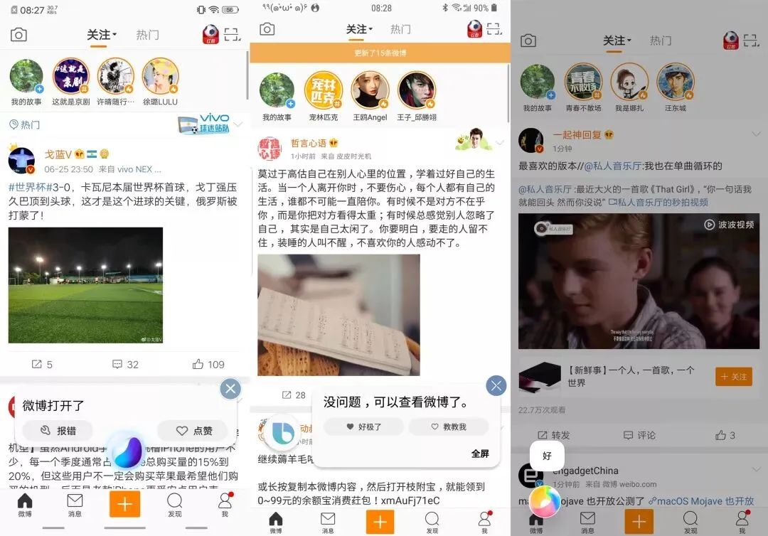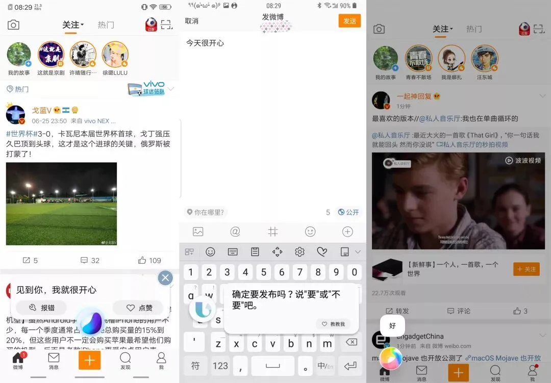微博方面,目前只有 Bixby 支持自动刷新微博和用语音发布微博,另外两个只支持打开微博,这里用的命令分别是“帮我刷微博”和“发微博,今天很开心”。