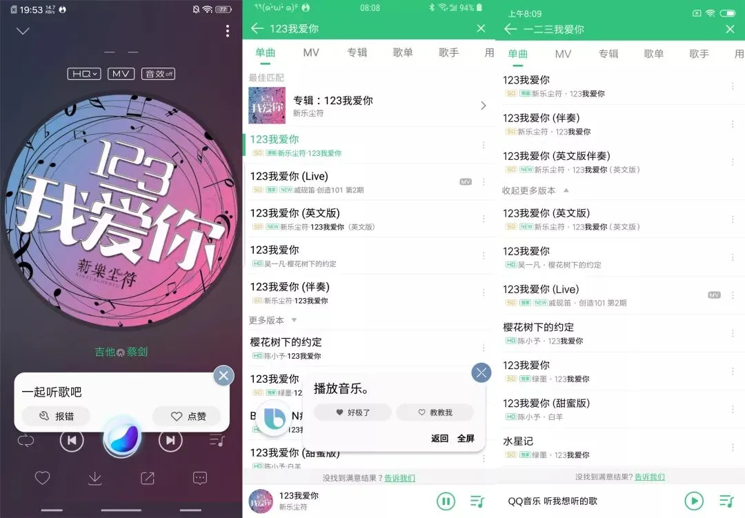 用 QQ 音乐播放歌曲,三者都支持搜索歌名并播放,不过小爱同学在数字方面偏好中文,所以可能会存在无法播放的情况。Jovi 表现最好,会自动弹开播放控制界面。