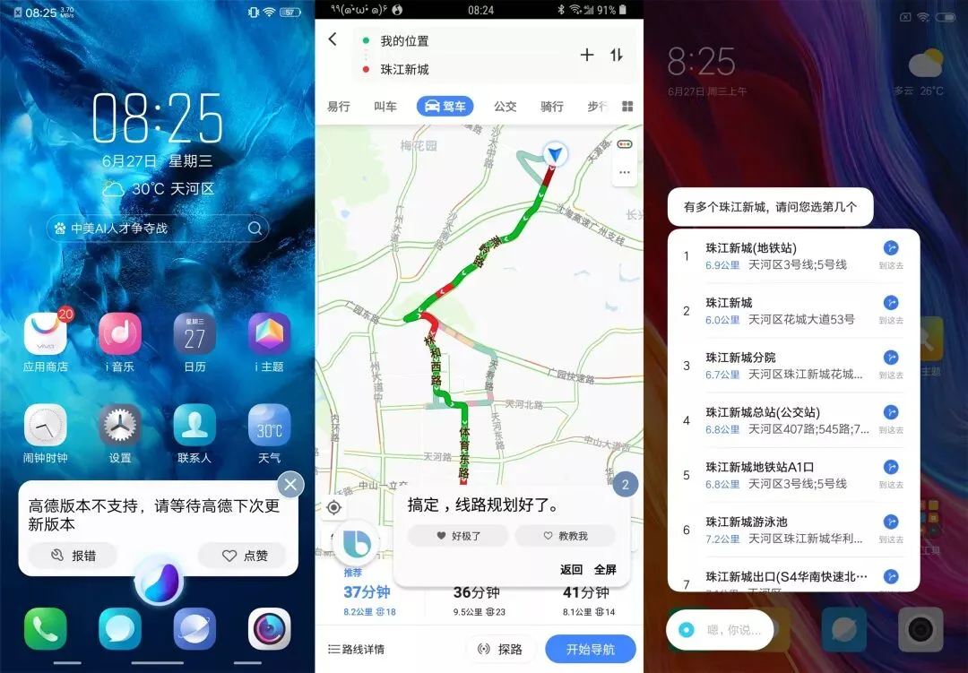 一个比较意外的状况是,在测试高德地图导航的时候,Jovi 提示版本不支持,要等待高德下次更新版本。Bixby 是直接跳转至驾车路线,而小爱则让用户选择具体的地点并自动开启导航。
