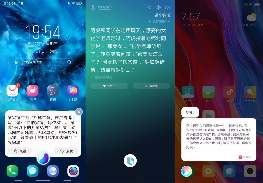 最后测试的是这 3 位 AI 助手的智能性,也就是对话和信息检索能力。Jovi、Bixby 和小爱同学都支持语音对话,但 Bixby 的声音更贴近真人,一些语调读的颇为自然,另外两位声音略显机械生硬。虽然它们都支持说笑话,不过都没能戳中 JQ 君的笑点。