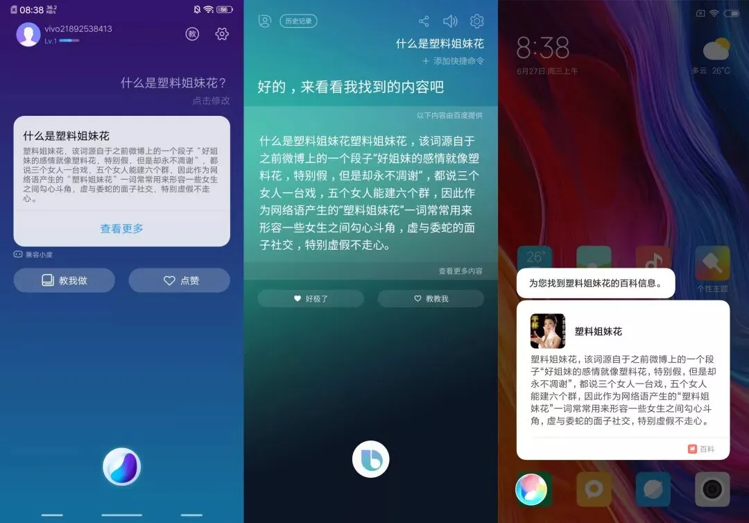 信息检索和词语查询的处理上,三者都是将百度百科的内容截取过来,不同的是小爱同学还会配一张图。
