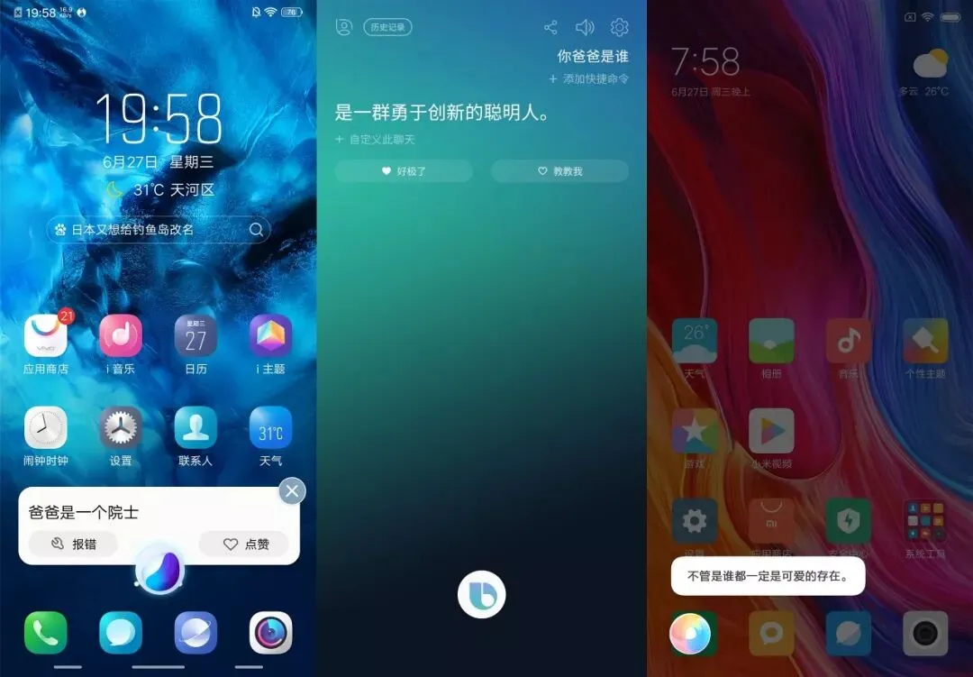 当问及“你爸爸是谁”,Jovi 直言爸爸是“一个院士”,Bixby 称是“一群勇于创新的聪明人”,小爱同学回答最模糊,“不管是谁都一定是可爱的存在”。