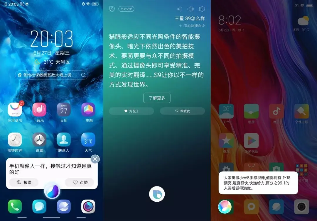 再来看看 AI 助手打广告的能力,JQ 君分别询问 vivo NEX、三星 S9 和小米 8 怎么样,Jovi 的回答比较客观,Bixby 和小爱同学的回复比较“功利”。