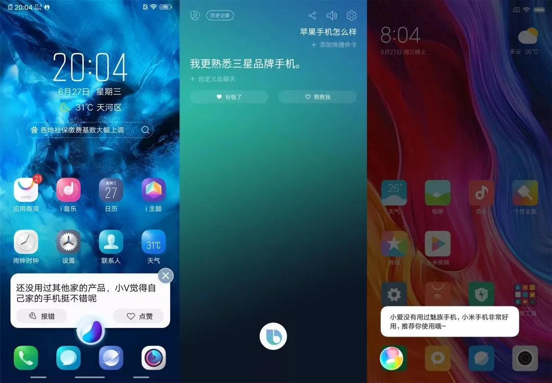 JQ 君再分别问 Jovi、Bixby 和小爱同学,OPPO 手机、苹果手机和魅族手机怎么样,三者回答基本统一口径:友商好不好我不知道,但我们家的手机很不错。