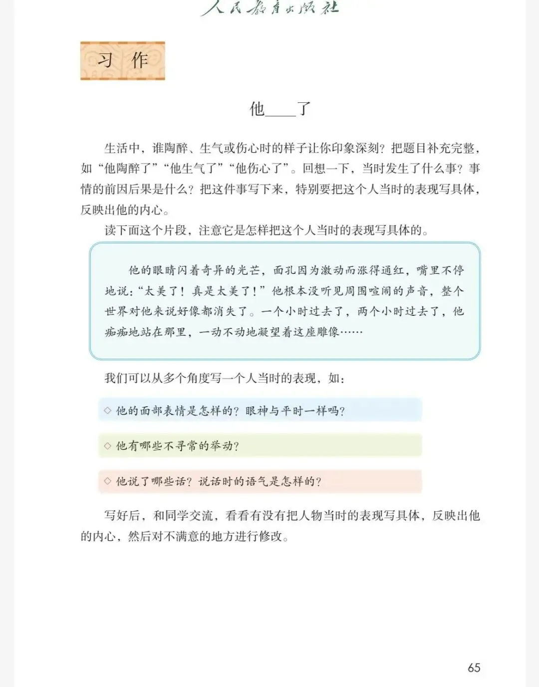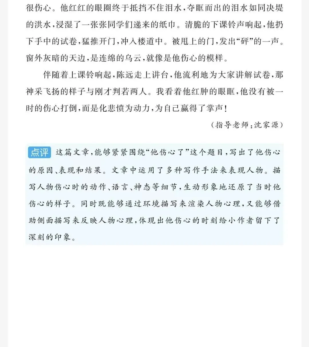 再比如写 “他伤心了”:“操场上同学都在笑闹,跳绳的绳子甩得‘啪啪’响,但他坐在台阶上,连风把作业本吹翻了,都没伸手去捡,只是盯着地面,肩膀一抽一抽的。”