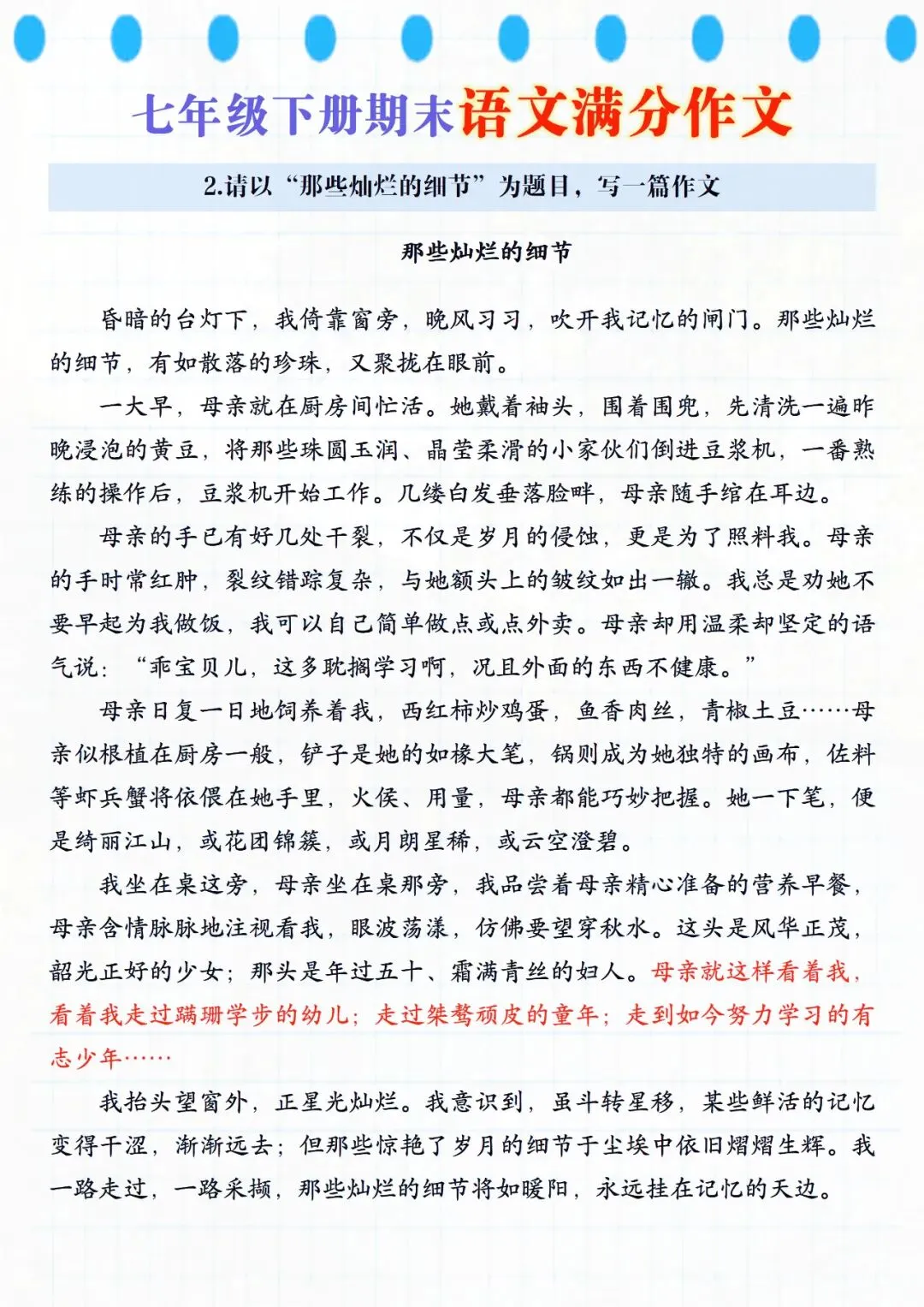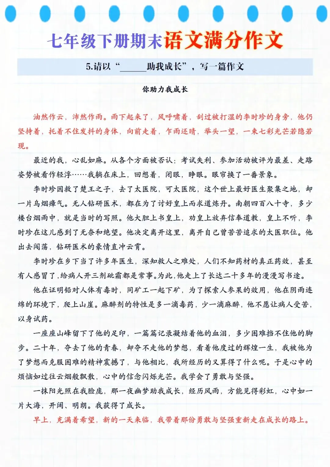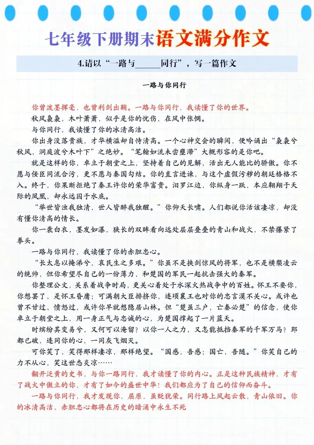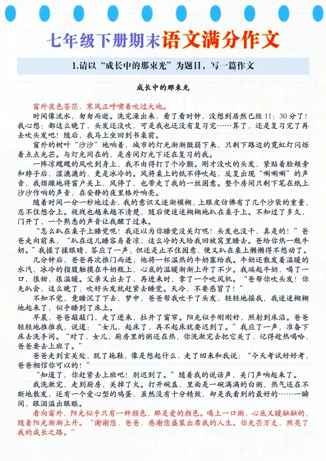 今天老师为大家整理完了:七年级下册语文 期末押题满分作文 电子版可打印!