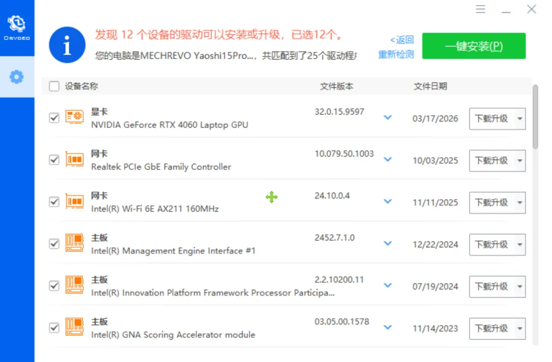 点击“扫描”,它会自动检测当前电脑缺失或需要更新的驱动,比如显卡、声卡、网卡这些,都会一条条列出来。