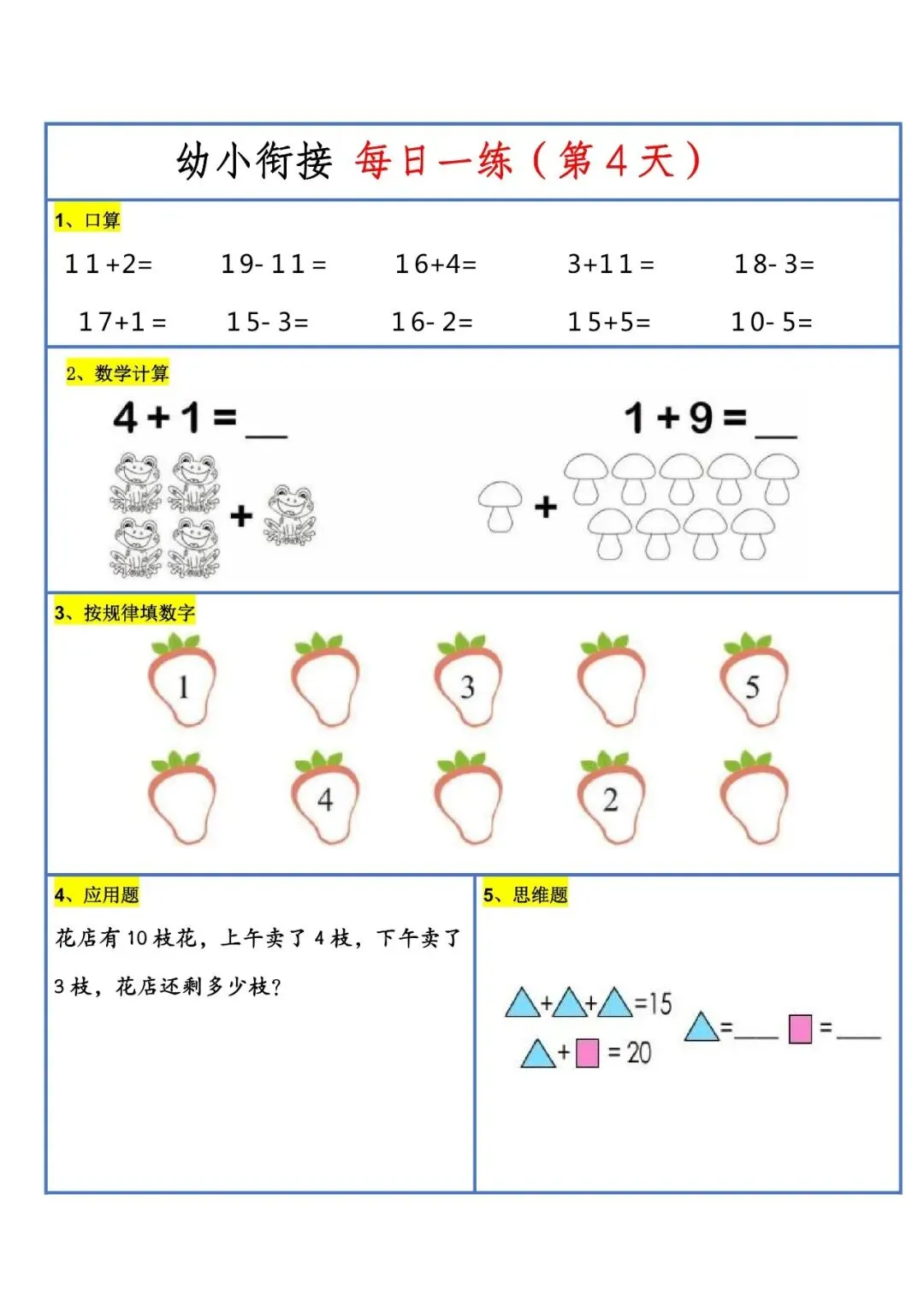 | 以 30 天为周期设计数学每日练习,涵盖口算、竖式计算、数的分解与组合、应用题及思维题,还包含数字排序、规律填空、看图列算式等题型,循序渐进提升幼儿数学计算与逻辑思维能力。 |