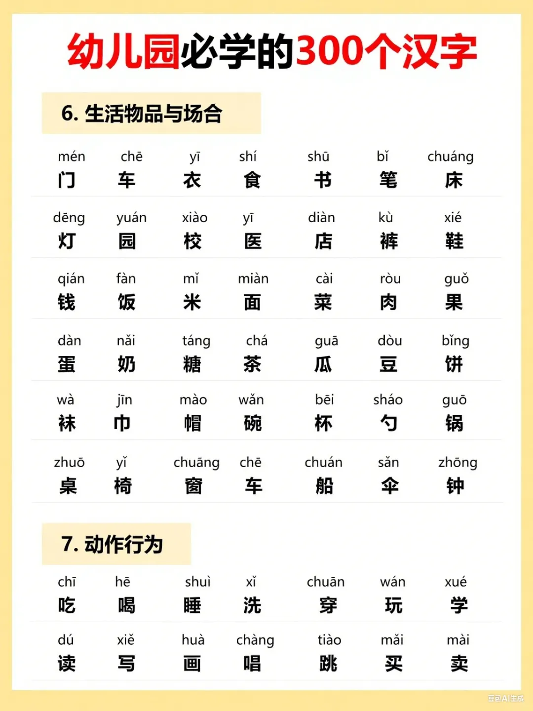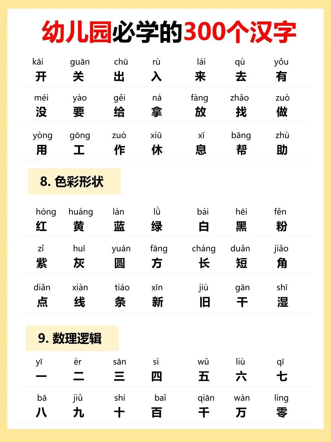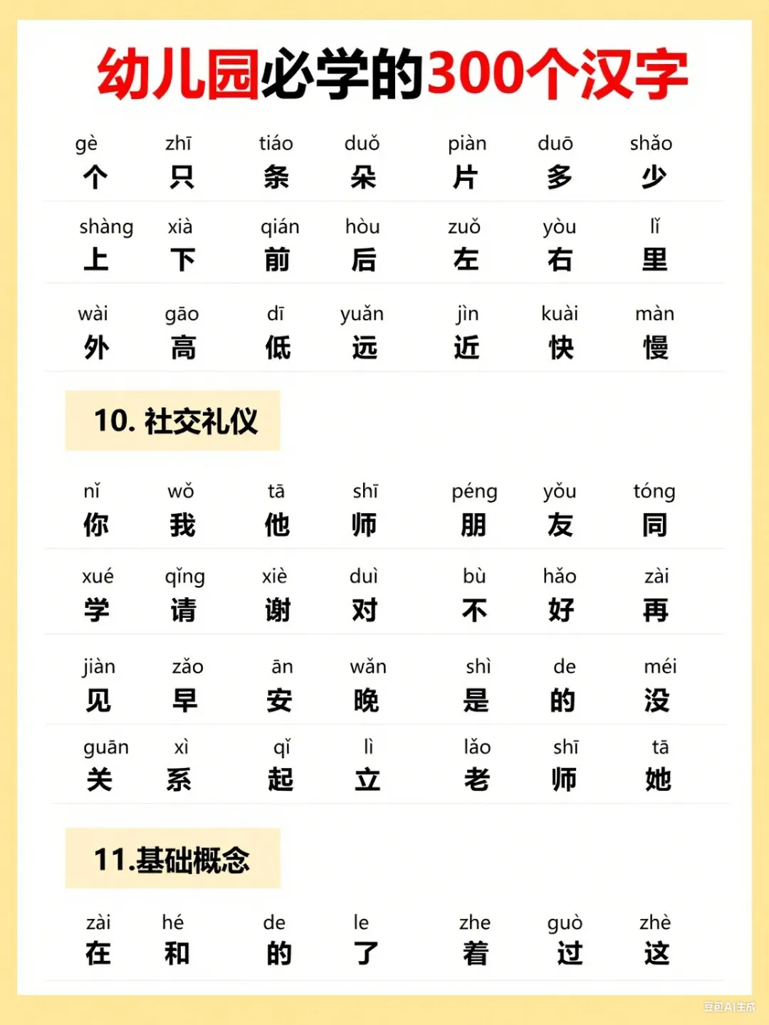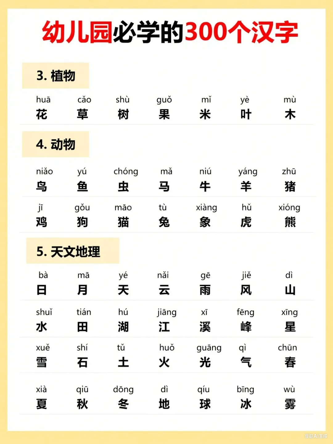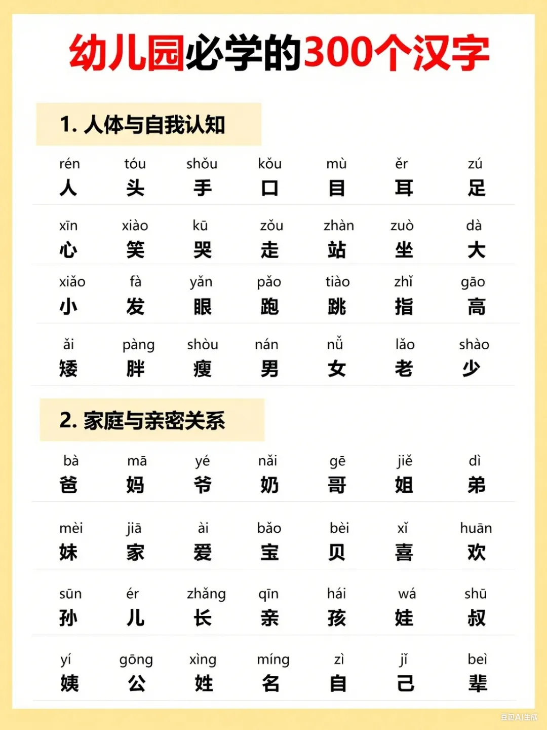 | 整理幼儿园阶段必学的 300 个基础汉字,按人体认知、家庭关系、动植物、天文地理等 11 个类别划分,每个汉字标注拼音,涵盖生活常用字,适配幼儿识字启蒙,助力搭建基础汉字储备。 |