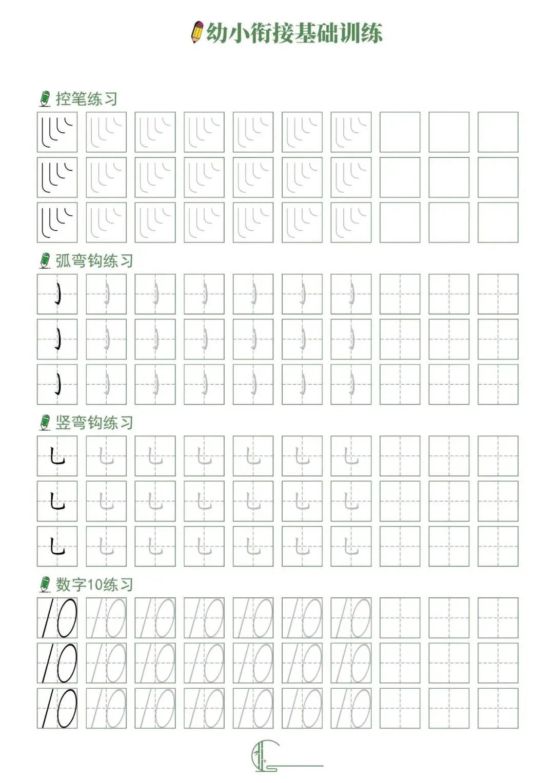 | 聚焦幼小衔接阶段的控笔训练,包含点、横、竖、折、弯钩等基础笔画练习,同步搭配数字 0-10 的书写训练,题型简洁针对性强,帮助幼儿规范书写姿势,夯实书写基础。 |