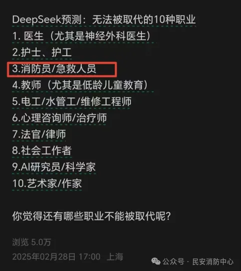 人工智能正在取代大量工厂及服务性初级岗位,人工智能的高级货DeepSeek正给民事律师、公务员等高级岗位造成冲击,但是DeepSeek说消防员是永远不会被取代的职业!