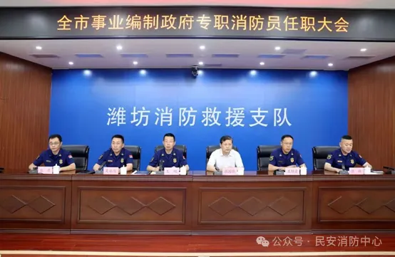 ▲2023年6月15日,山东潍坊消防支队隆重召开“潍坊市事业编制政府专职消防员任职大会”,为首批14名优秀政府专职消防员颁发任命书。