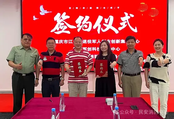 ▲与重庆市江北区退役军人创业创新集群中心、重庆军创科技孵化中心举行盛大签约仪式(2024年6月)