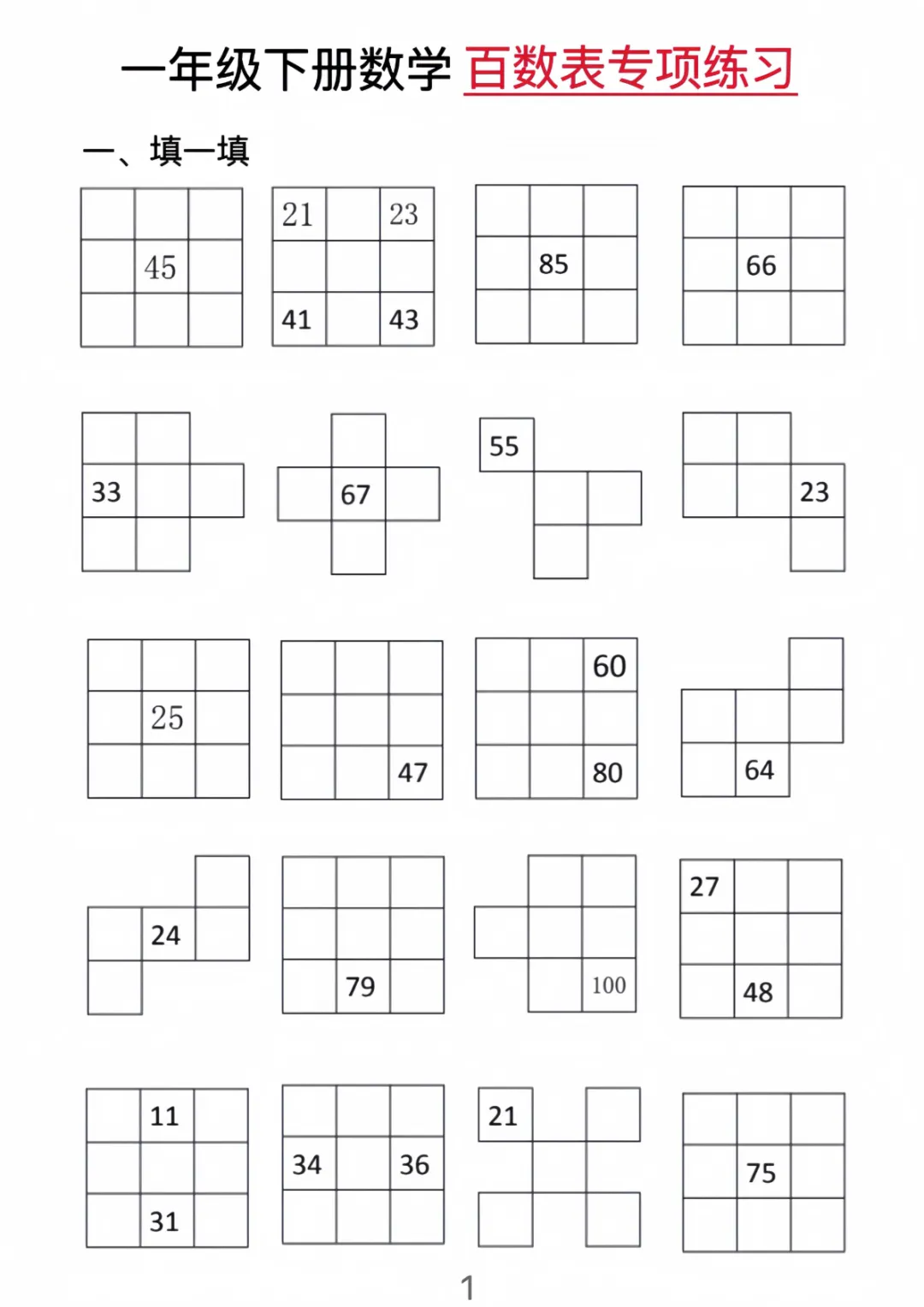 【免费下载】一年级(下)数学 百数表专项练习,PDF电子版,可打印
