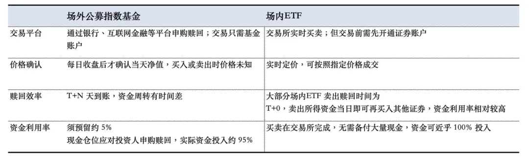 场外公募指数基金 v.s. 场内ETF:场内ETF是把场外公募指数基金搬进交易所的产物,同样追踪指数,具备实时定价与更高的资金利用率。