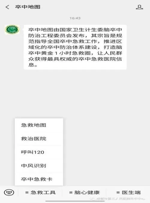 “成都市卒中急救地图”的推出,将全市医疗资源进行充分整合,广大群众能在微信公众号“卒中地图”上查询到附近的救治医院,在最短的时间内将卒中病人送达有救治能力的医院进行规范化救治。以下将用图文结合的方式向大家介绍如何通过“卒中地图”微信公众号快速了解您身边的卒中救治医院。