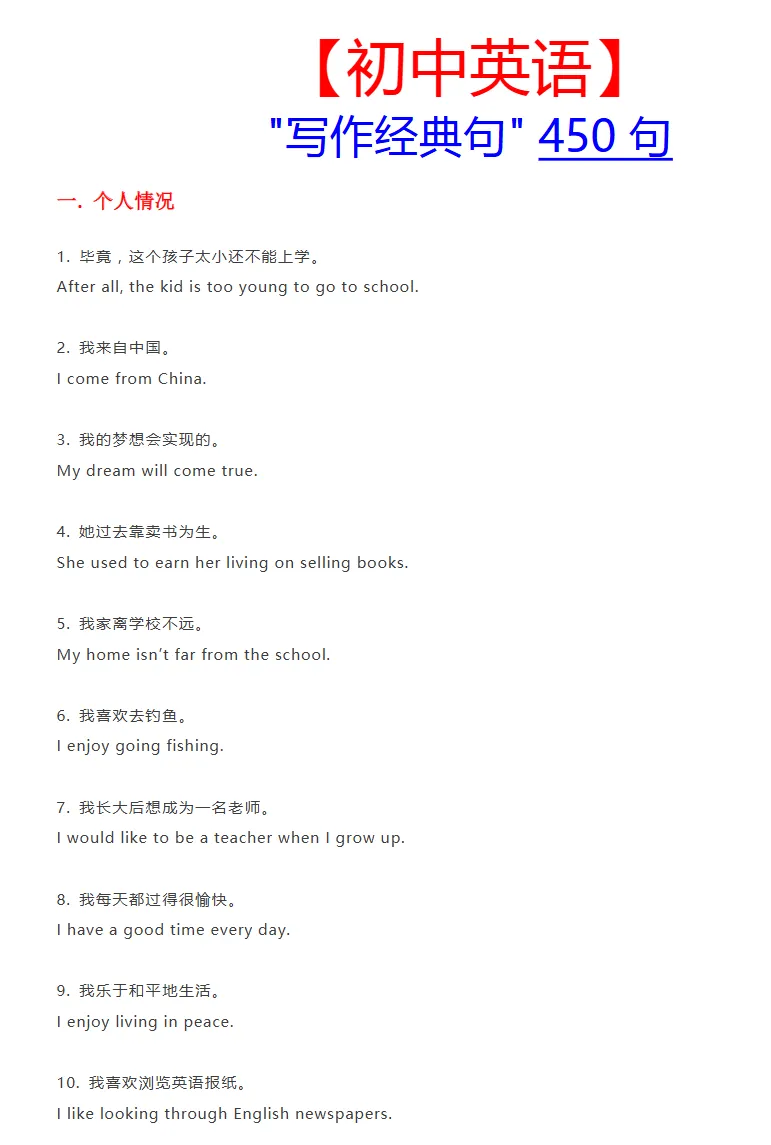 初中英语写作经典句450句(电子版pdf) 下方公众号回复【初中】 领取本公众号所有初中资源 今天老师给大家整理了:初中英语写作经典句450句(电子版pdf)今日资料在3月30日文件夹中,想要获取电子打印版请识别下方二维码 (点击可查看大图,超清晰) 扫描下方二维码 免费领取完整电子版资料 👇👇👇