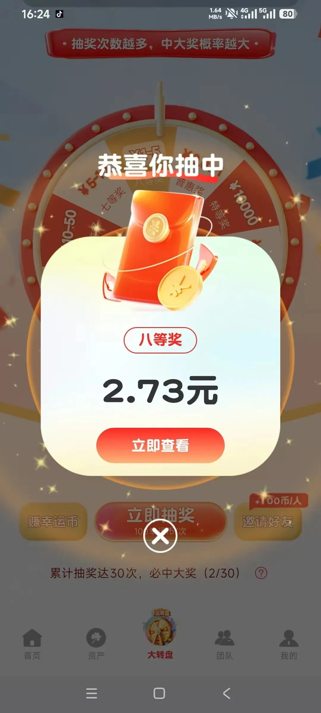 点击底部导航栏“大转盘”(如图3),进入转盘界面。界面展示中奖公示(如“恭喜茉**获得六等奖16.55元”),提示“抽奖次数越多,中大奖概率越大”。