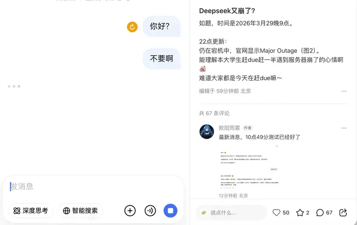 许多网友发文称“DeepSeek崩了”