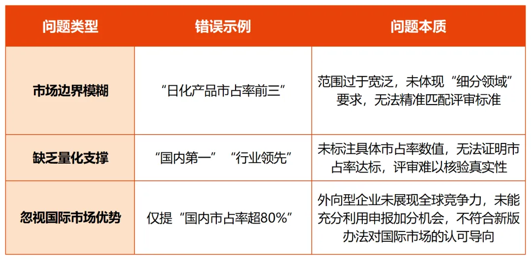 3.国内外市场可同步申报:既可以填报国内市占率,也可突出国际市场份额,两者均为评审认可的有效依据,外向型企业可重点展现国际优势。
