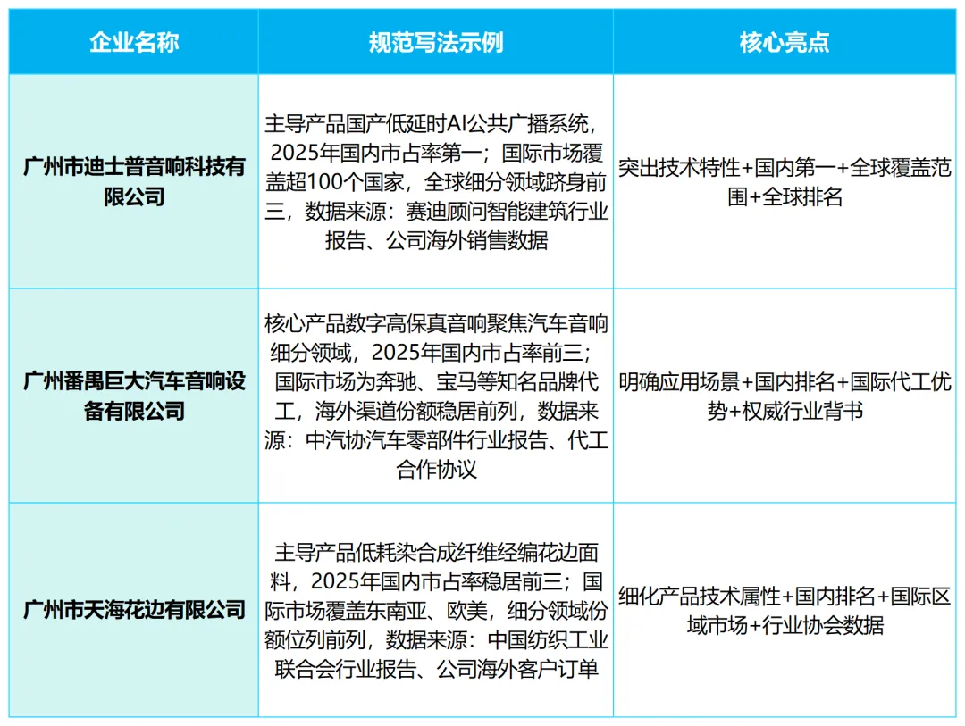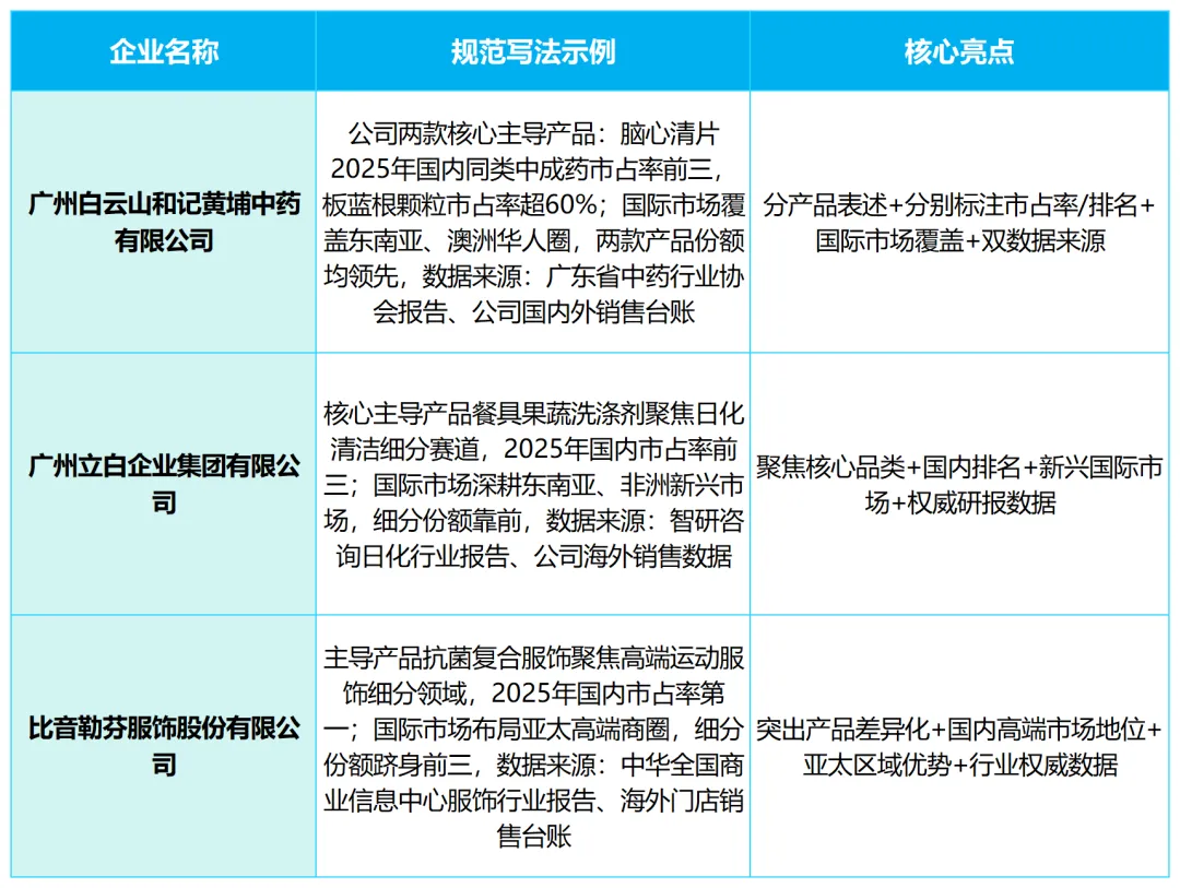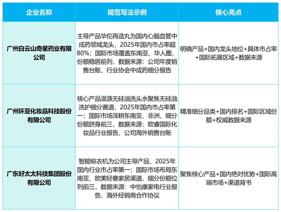 结合广州企业真实案例,分领域拆解规范表述,覆盖消费品、制造科技、多产品场景,标注核心亮点,申报的企业可参考优化自身表述: