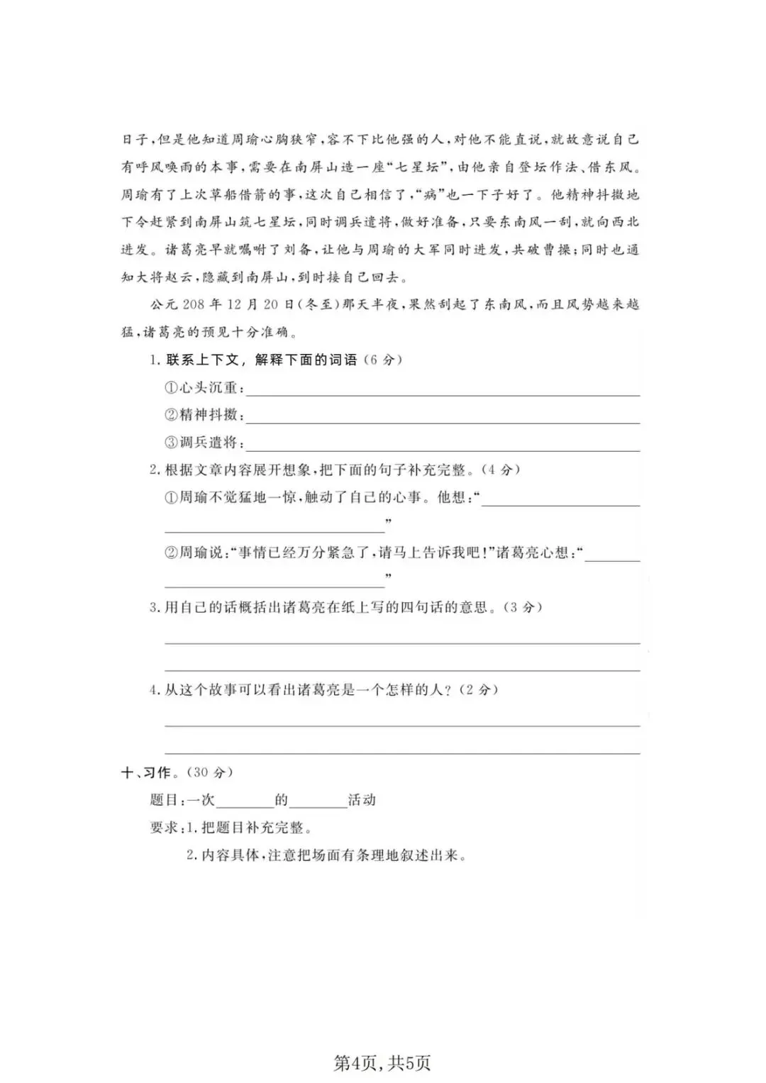 这份试卷紧扣教材重点,题型全面,涵盖字音辨析、看拼音写词语、形近字组词、古诗默写、句式转换、课外阅读及习作等板块,既考查基础知识,又注重能力拓展。亮点在于阅读题选材经典(《诸葛亮借东风》),能有效提升学生的阅读理解与思维分析能力;习作部分引导学生有条理地描写活动场面,训练表达与观察力。