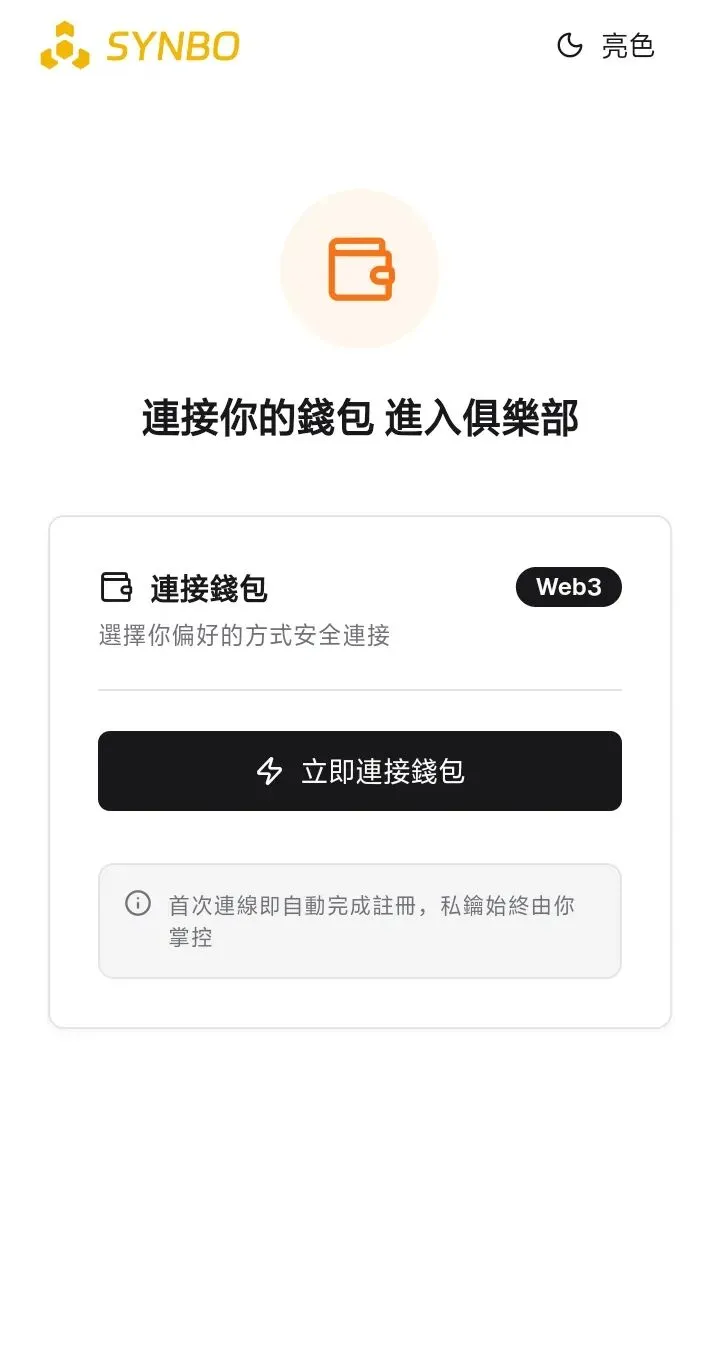 进入 SYNBO CLUB后,首先看到的是 钱包登录页面。