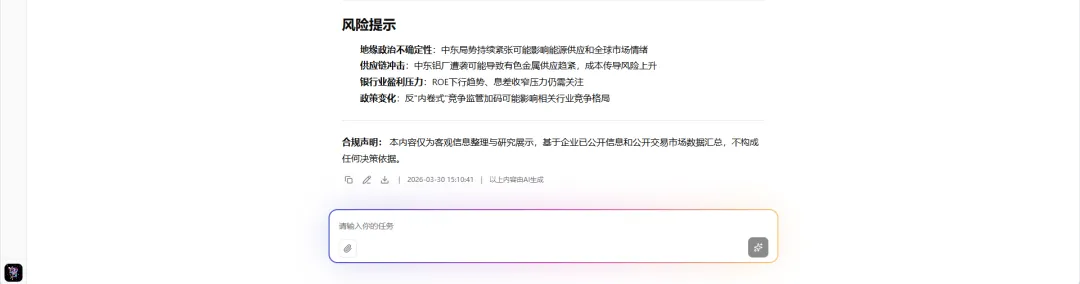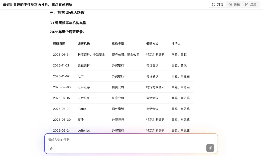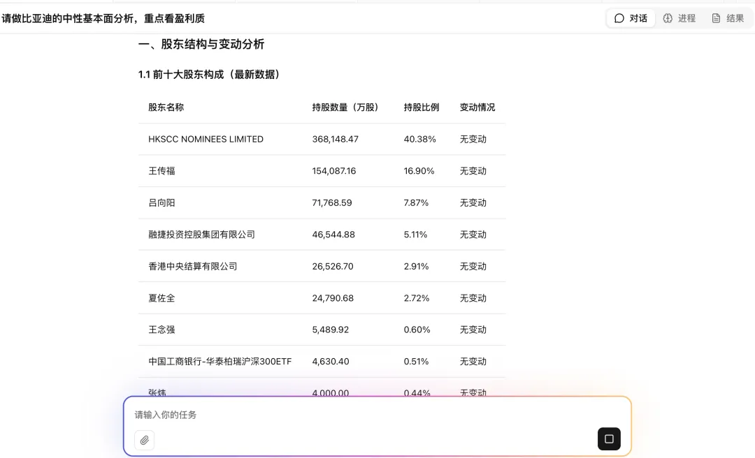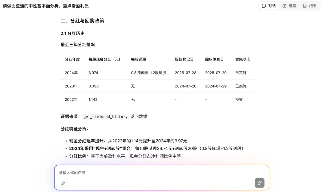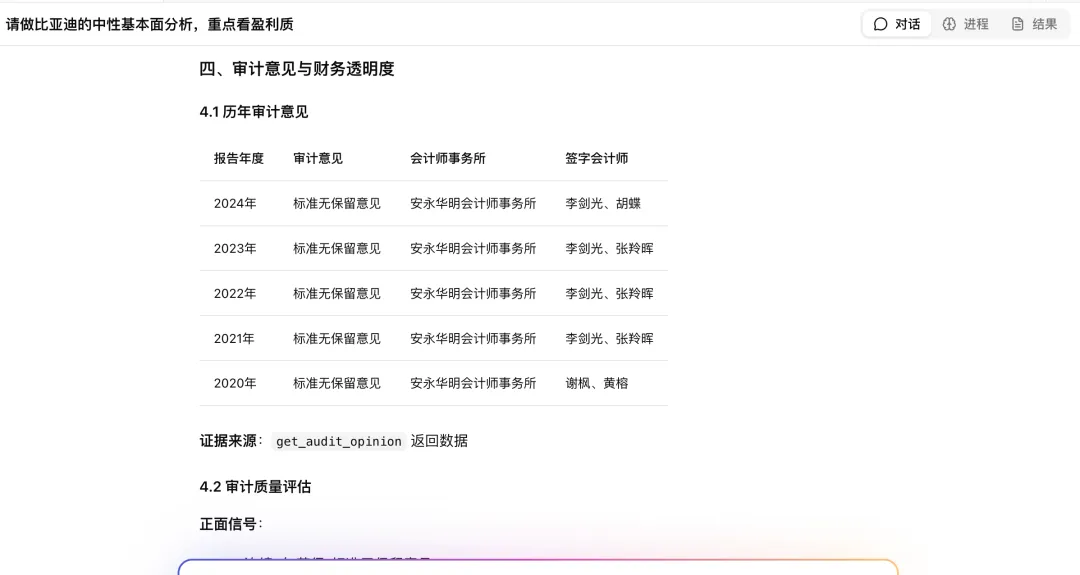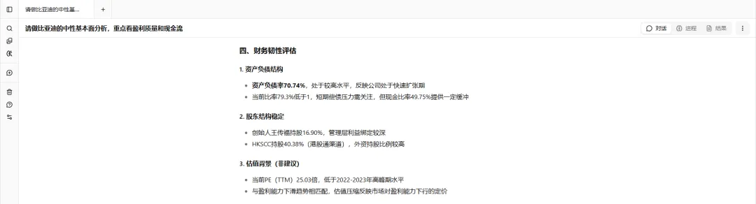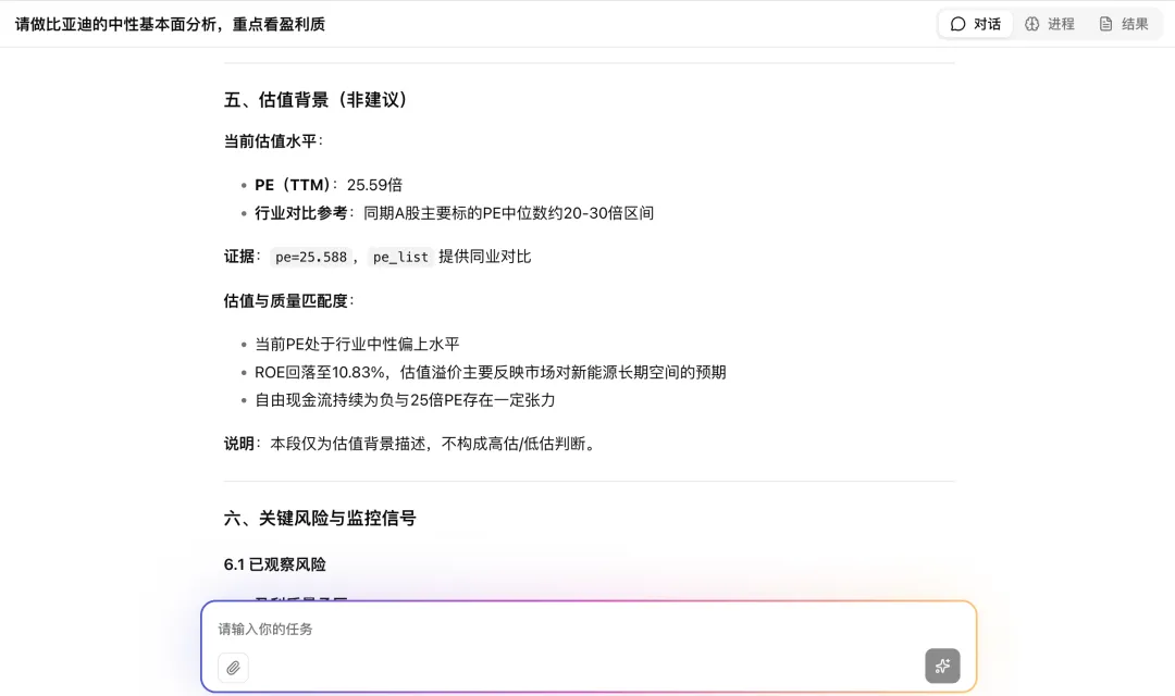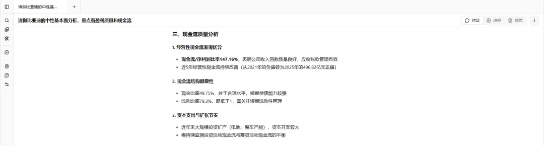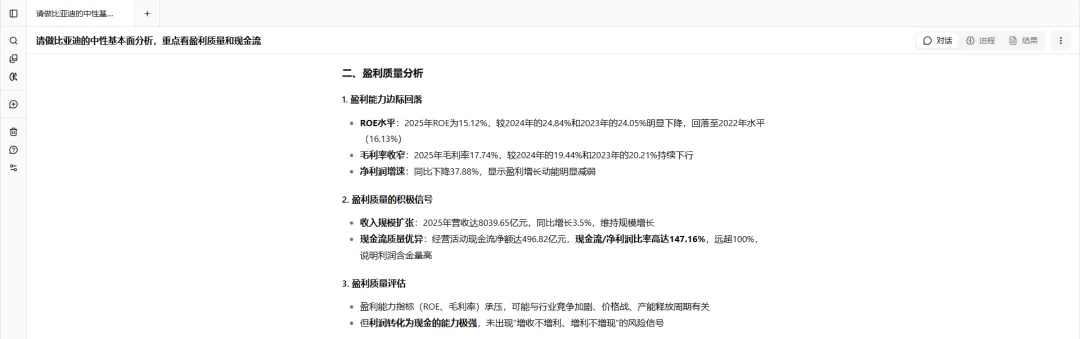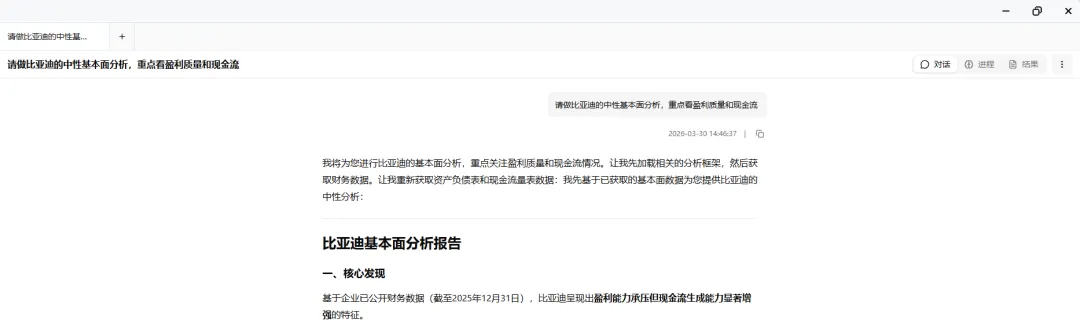 例如,输入“请做比亚迪的中性基本面分析,重点看盈利质量和现金流。”