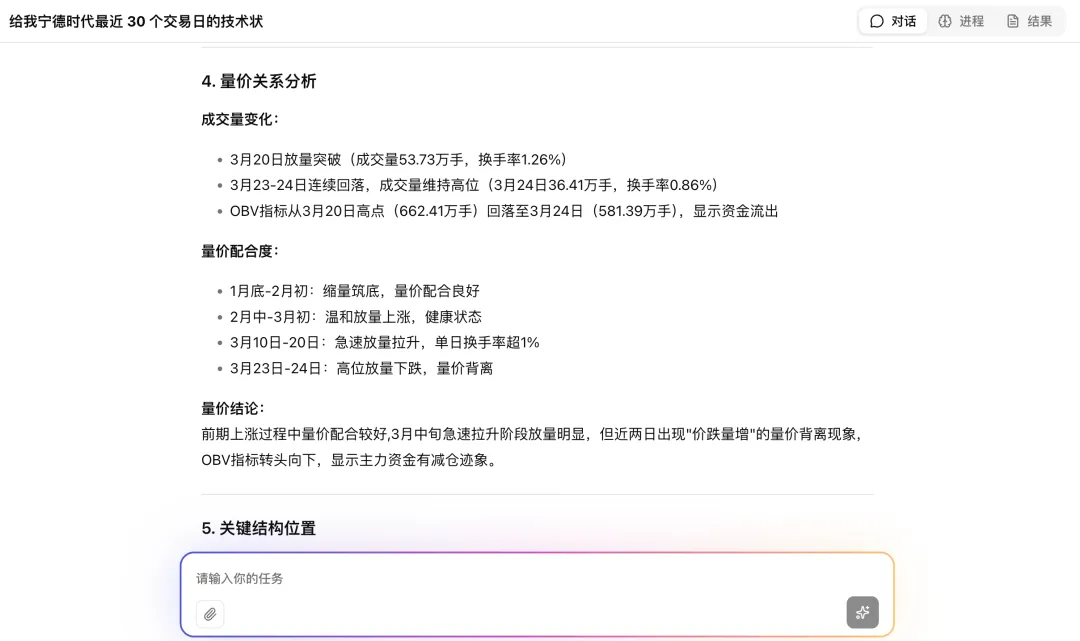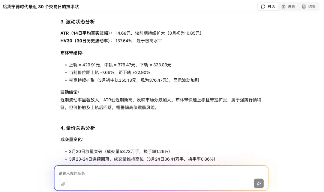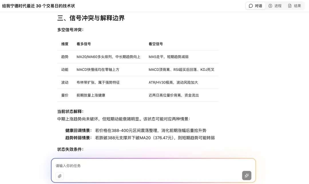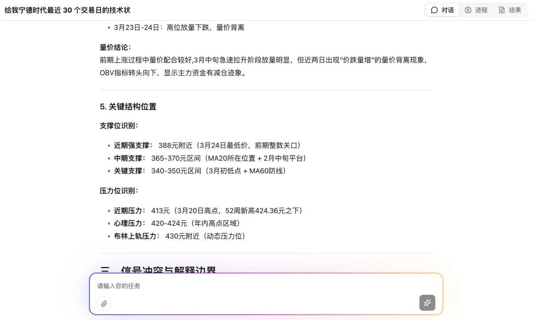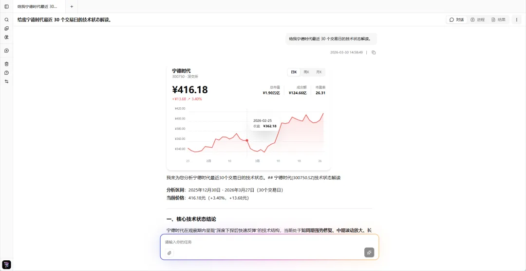 例如,输入“给我宁德时代最近 30 个交易日的技术状态解读。”
