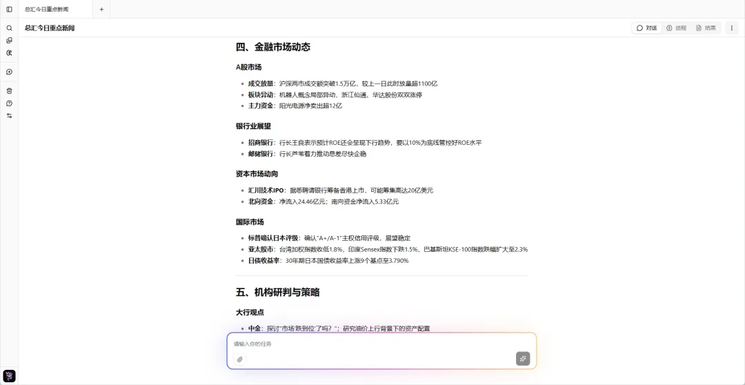 当你已经有一个明确的关注对象,比如某家公司、某个指数、某个行业热点或某段时间的新闻,希望快速获得整理后的结果,而不是自己分散去查多个页面时,财经Agent可以给您较大的助力。