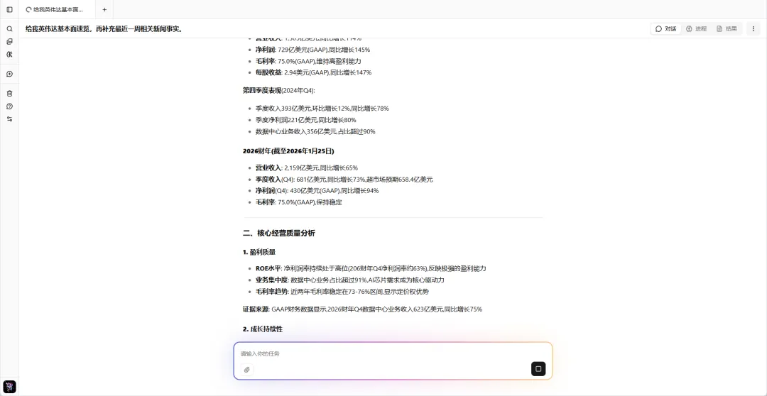例如,输入“给我英伟达基本面速览,再补充最近一周相关新闻事实。”: