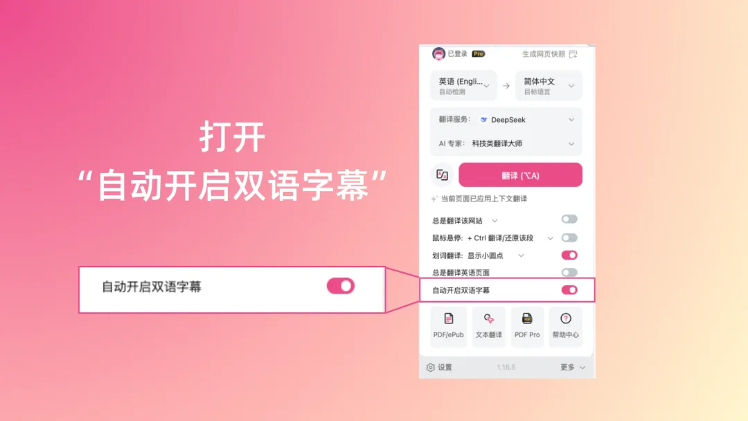 📌 视频字幕:打开 YouTube 视频后,点击沉浸式翻译面板,勾选「自动开启双语字幕」即可。英文和中文同时显示在屏幕上,用来刷技术讲座、英文教程,比任何字幕软件都流畅。Zoom、Google Meet、Teams 的在线会议也同样支持。