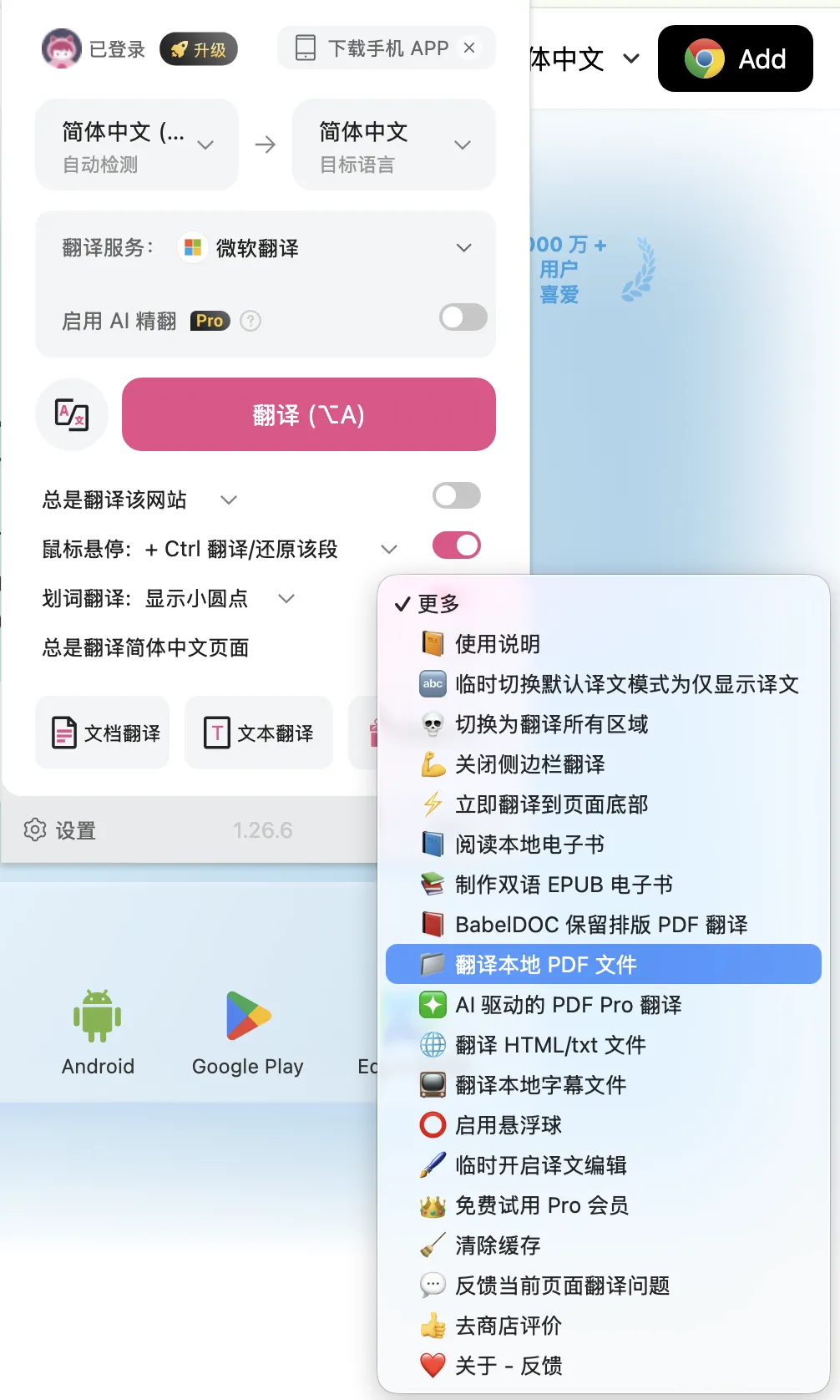 📌 PDF 文献:这是最让我惊喜的部分。网页内的 PDF 直接点插件图标→翻译 PDF;本地文件通过「插件→更多→翻译本地 PDF」上传。段落级双语翻译,排版基本不乱。以前读一篇英文文献要一个多小时,现在三十分钟能摸清全文骨架。
