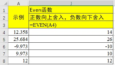 继续看 EVEN 函数,它的作用是将舍入的正数值向上舍入到的最接近的偶数,负数值向下舍入到最接近的偶数。