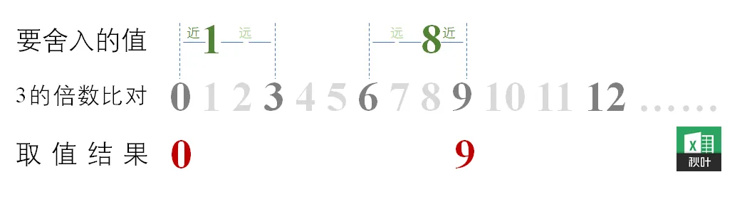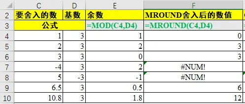 再看 MROUND 函数,MROUND 函数作用是获取设定的基数中,所有基数倍数中最接近你所要舍入的数值。